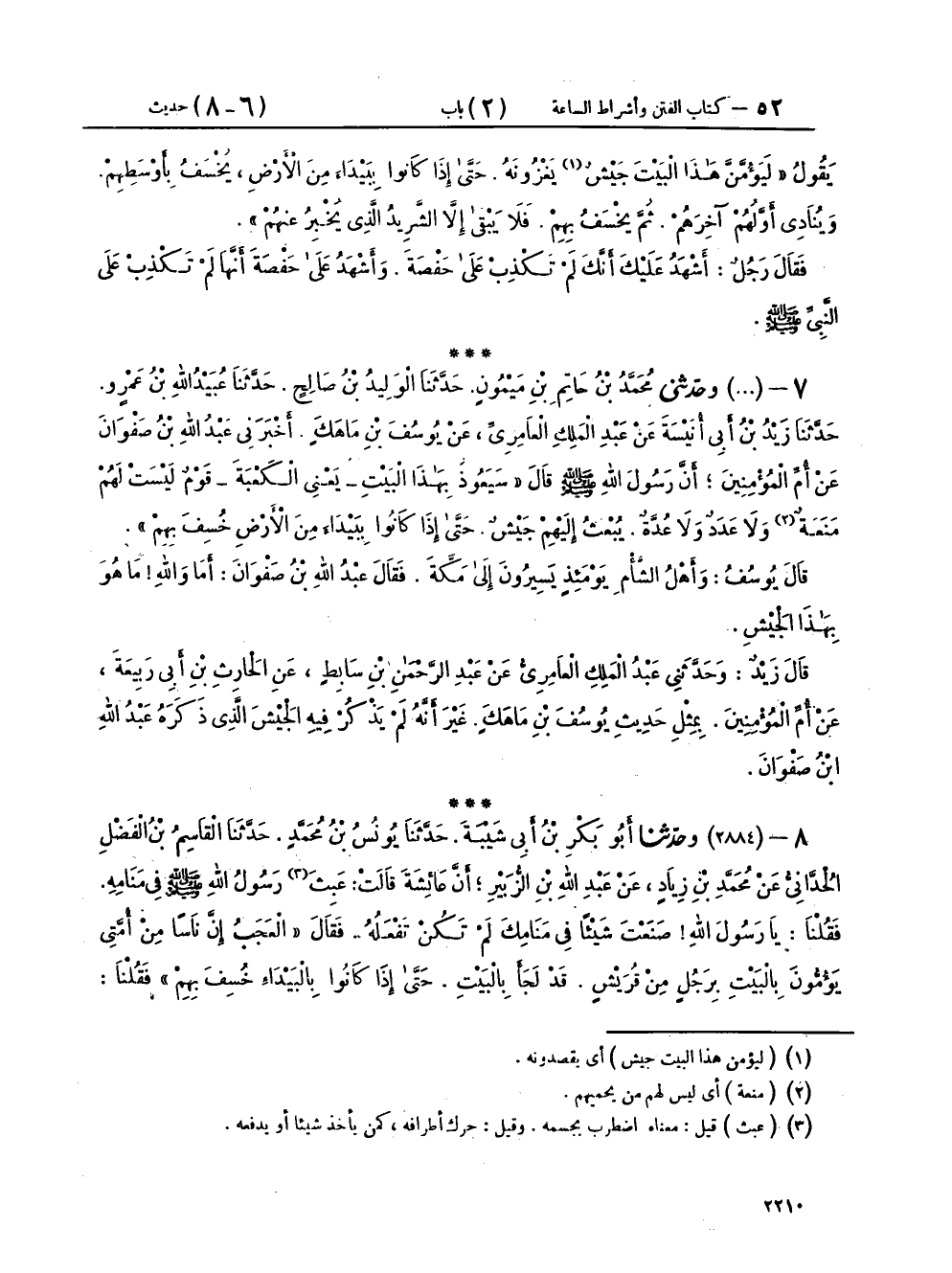 ٧ - (٢٨٨٣) وحَدَّثَنِي مُحَمَّدُ بْنُ حَاتِمِ بْنِ مَيْمُونٍ، حَدَّثَنَا الْوَلِيدُ بْنُ صَالِحٍ، حَدَّثَنَا عُبَيْدُ اللهِ بْنُ عَمْرٍو، حَدَّثَنَا زَيْدُ بْنُ أَبِي أُنَيْسَةَ، عَنْ عَبْدِ الْمَلِكِ الْعَامِرِيِّ، عَنْ يُوسُفَ بْنِ مَاهَكَ، أَخْبَرَنِي عَبْدُ اللهِ بْنُ صَفْوَانَ، عَنْ أُمِّ الْمُؤْمِنِينَ، أَنَّ رَسُولَ اللهِ صَلَّى اللهُ عَلَيْهِ وَسَلَّمَ، قَالَ: «سَيَعُوذُ بِهَذَا الْبَيْتِ - يَعْنِي الْكَعْبَةَ - قَوْمٌ لَيْسَتْ لَهُمْ مَنَعَةٌ، وَلَا عَدَدٌ وَلَا عُدَّةٌ، يُبْعَثُ إِلَيْهِمْ جَيْشٌ، حَتَّى إِذَا كَانُوا بِبَيْدَاءَ مِنَ الْأَرْضِ خُسِفَ بِهِمْ»، قَالَ يُوسُفُ: وَأَهْلُ الشَّأْمِ يَوْمَئِذٍ يَسِيرُونَ إِلَى مَكَّةَ، فَقَالَ عَبْدُ اللهِ بْنُ صَفْوَانَ: أَمَا وَاللهِ مَا هُوَ بِهَذَا الْجَيْشِ، قَالَ زَيْدٌ: وَحَدَّثَنِي عَبْدُ الْمَلِكِ الْعَامِرِيُّ، عَنْ عَبْدِ الرَّحْمَنِ بْنِ سَابِطٍ، عَنِ الْحَارِثِ بْنِ أَبِي رَبِيعَةَ، عَنْ أُمِّ الْمُؤْمِنِينَ، بِمِثْلِ حَدِيثِ يُوسُفَ بْنِ مَاهَكَ، غَيْرَ أَنَّهُ لَمْ يَذْكُرْ فِيهِ الْجَيْشَ الَّذِي ذَكَرَهُ عَبْدُ اللهِ بْنُ صَفْوَانَ