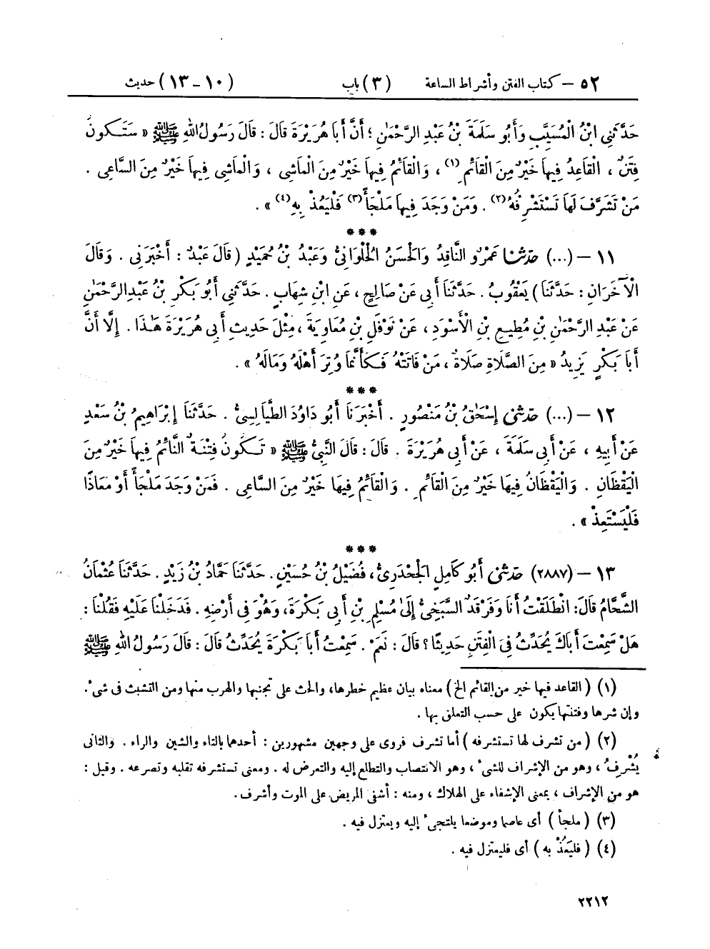 ١٣ - (٢٨٨٧) حَدَّثَنِي أَبُو كَامِلٍ الْجَحْدَرِيُّ فُضَيْلُ بْنُ حُسَيْنٍ، حَدَّثَنَا حَمَّادُ بْنُ زَيْدٍ، حَدَّثَنَا عُثْمَانُ الشَّحَّامُ، قَالَ: انْطَلَقْتُ أَنَا وَفَرْقَدٌ السَّبَخِيُّ، إِلَى مُسْلِمِ بْنِ أَبِي بَكْرَةَ وَهُوَ فِي أَرْضِهِ، فَدَخَلْنَا عَلَيْهِ فَقُلْنَا: هَلْ سَمِعْتَ أَبَاكَ يُحَدِّثُ فِي الْفِتَنِ حَدِيثًا؟ قَالَ: نَعَمْ، سَمِعْتُ أَبَا بَكْرَةَ يُحَدِّثُ، قَالَ: قَالَ رَسُولُ اللهِ صَلَّى اللهُ عَلَيْهِ وَسَلَّمَ: " إِنَّهَا سَتَكُونُ فِتَنٌ: أَلَا ثُمَّ تَكُونُ فِتْنَةٌ الْقَاعِدُ فِيهَا خَيْرٌ مِنَ الْمَاشِي فِيهَا، وَالْمَاشِي فِيهَا خَيْرٌ مِنَ السَّاعِي إِلَيْهَا. أَلَا، فَإِذَا نَزَلَتْ أَوْ وَقَعَتْ، فَمَنْ كَانَ لَهُ إِبِلٌ فَلْيَلْحَقْ بِإِبِلِهِ، وَمَنْ كَانَتْ لَهُ غَنَمٌ فَلْيَلْحَقْ بِغَنَمِهِ، وَمَنْ كَانَتْ لَهُ أَرْضٌ فَلْيَلْحَقْ بِأَرْضِهِ " قَالَ فَقَالَ رَجُلٌ: يَا رَسُولَ اللهِ أَرَأَيْتَ مَنْ لَمْ يَكُنْ لَهُ إِبِلٌ وَلَا غَنَمٌ وَلَا أَرْضٌ؟ قَالَ: «يَعْمِدُ إِلَى سَيْفِهِ فَيَدُقُّ عَلَى حَدِّهِ بِحَجَرٍ، ثُمَّ لِيَنْجُ إِنِ اسْتَطَاعَ النَّجَاءَ، اللهُمَّ هَلْ بَلَّغْتُ؟ اللهُمَّ هَلْ بَلَّغْتُ؟ اللهُمَّ هَلْ بَلَّغْتُ؟» قَالَ: فَقَالَ رَجُلٌ: يَا رَسُولَ اللهِ أَرَأَيْتَ إِنْ أُكْرِهْتُ حَتَّى يُنْطَلَقَ بِي إِلَى أَحَدِ الصَّفَّيْنِ، أَوْ إِحْدَى الْفِئَتَيْنِ، فَضَرَبَنِي رَجُلٌ بِسَيْفِهِ، أَوْ يَجِيءُ سَهْمٌ فَيَقْتُلُنِي؟ قَالَ: «يَبُوءُ بِإِثْمِهِ وَإِثْمِكَ، وَيَكُونُ مِنْ أَصْحَابِ النَّارِ»،