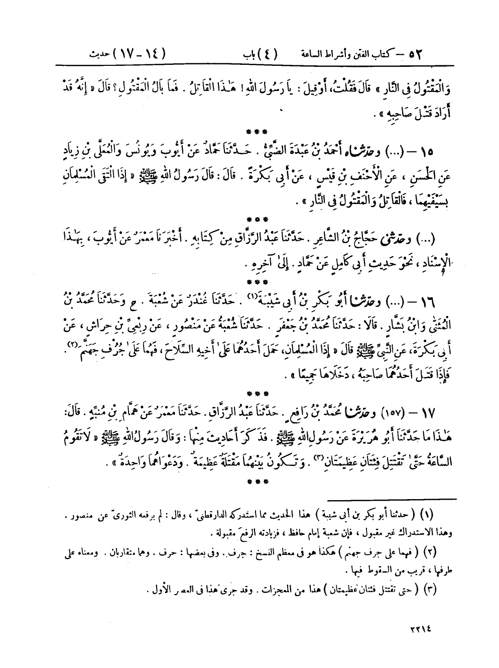 ١٦ - (٢٨٨٨) وَحَدَّثَنَا أَبُو بَكْرِ بْنُ أَبِي شَيْبَةَ، حَدَّثَنَا غُنْدَرٌ، عَنْ شُعْبَةَ، ح وَحَدَّثَنَا مُحَمَّدُ بْنُ الْمُثَنَّى، وَابْنُ بَشَّارٍ، قَالَا: حَدَّثَنَا مُحَمَّدُ بْنُ جَعْفَرٍ، حَدَّثَنَا شُعْبَةُ، عَنْ مَنْصُورٍ، عَنْ رِبْعِيِّ بْنِ حِرَاشٍ، عَنْ أَبِي بَكْرَةَ، عَنِ النَّبِيِّ صَلَّى اللهُ عَلَيْهِ وَسَلَّمَ، قَالَ: «إِذَا الْمُسْلِمَانِ، حَمَلَ أَحَدُهُمَا عَلَى أَخِيهِ السِّلَاحَ، فَهُمَا عَلَى جُرْفِ جَهَنَّمَ، فَإِذَا قَتَلَ أَحَدُهُمَا صَاحِبَهُ، دَخَلَاهَا جَمِيعًا»