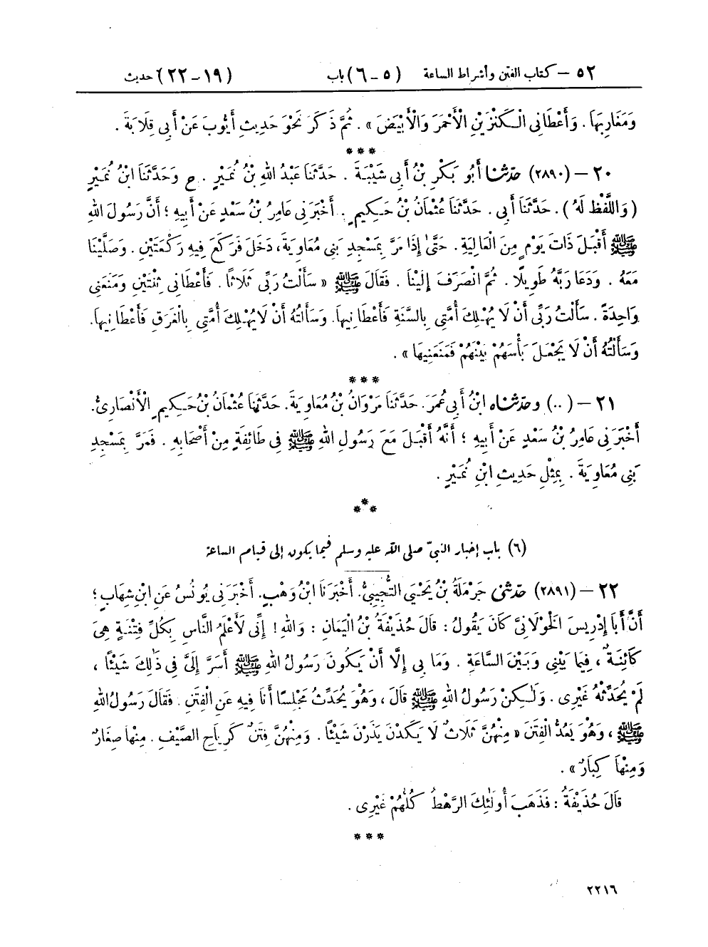 ٢٠ - (٢٨٩٠) حَدَّثَنَا أَبُو بَكْرِ بْنُ أَبِي شَيْبَةَ، حَدَّثَنَا عَبْدُ اللهِ بْنُ نُمَيْرٍ، ح وَحَدَّثَنَا ابْنُ نُمَيْرٍ - وَاللَّفْظُ لَهُ - حَدَّثَنَا أَبِي، حَدَّثَنَا عُثْمَانُ بْنُ حَكِيمٍ، أَخْبَرَنِي عَامِرُ بْنُ سَعْدٍ، عَنْ أَبِيهِ، أَنَّ رَسُولَ اللهِ صَلَّى اللهُ عَلَيْهِ وَسَلَّمَ أَقْبَلَ ذَاتَ يَوْمٍ مِنَ الْعَالِيَةِ، حَتَّى إِذَا مَرَّ بِمَسْجِدِ بَنِي مُعَاوِيَةَ دَخَلَ فَرَكَعَ فِيهِ رَكْعَتَيْنِ، وَصَلَّيْنَا مَعَهُ، وَدَعَا رَبَّهُ طَوِيلًا، ثُمَّ انْصَرَفَ إِلَيْنَا، فَقَالَ صَلَّى اللهُ عَلَيْهِ وَسَلَّمَ: " سَأَلْتُ رَبِّي ثَلَاثًا، فَأَعْطَانِي ثِنْتَيْنِ وَمَنَعَنِي وَاحِدَةً، سَأَلْتُ رَبِّي: أَنْ لَا يُهْلِكَ أُمَّتِي بِالسَّنَةِ فَأَعْطَانِيهَا، وَسَأَلْتُهُ أَنْ لَا يُهْلِكَ أُمَّتِي بِالْغَرَقِ فَأَعْطَانِيهَا، وَسَأَلْتُهُ أَنْ لَا يَجْعَلَ بَأْسَهُمْ بَيْنَهُمْ فَمَنَعَنِيهَا "،