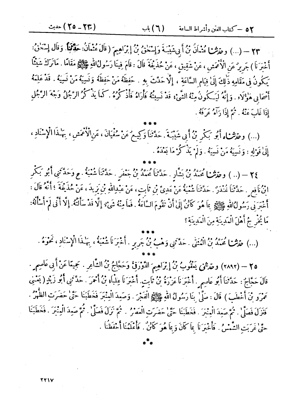 ٢٣ - (٢٨٩١) وَحَدَّثَنَا عُثْمَانُ بْنُ أَبِي شَيْبَةَ، وَإِسْحَاقُ بْنُ إِبْرَاهِيمَ - قَالَ عُثْمَانُ: حَدَّثَنَا، وقَالَ إِسْحَاقُ: أَخْبَرَنَا - جَرِيرٌ، عَنِ الْأَعْمَشِ، عَنْ شَقِيقٍ، عَنْ حُذَيْفَةَ، قَالَ: «قَامَ فِينَا رَسُولُ اللهِ صَلَّى اللهُ عَلَيْهِ وَسَلَّمَ مَقَامًا، مَا تَرَكَ شَيْئًا يَكُونُ فِي مَقَامِهِ ذَلِكَ إِلَى قِيَامِ السَّاعَةِ، إِلَّا حَدَّثَ بِهِ»، حَفِظَهُ مَنْ حَفِظَهُ وَنَسِيَهُ مَنْ نَسِيَهُ، قَدْ عَلِمَهُ أَصْحَابِي هَؤُلَاءِ، وَإِنَّهُ لَيَكُونُ مِنْهُ الشَّيْءُ قَدْ نَسِيتُهُ فَأَرَاهُ فَأَذْكُرُهُ، كَمَا يَذْكُرُ الرَّجُلُ وَجْهَ الرَّجُلِ إِذَا غَابَ عَنْهُ، ثُمَّ إِذَا رَآهُ عَرَفَهُ،