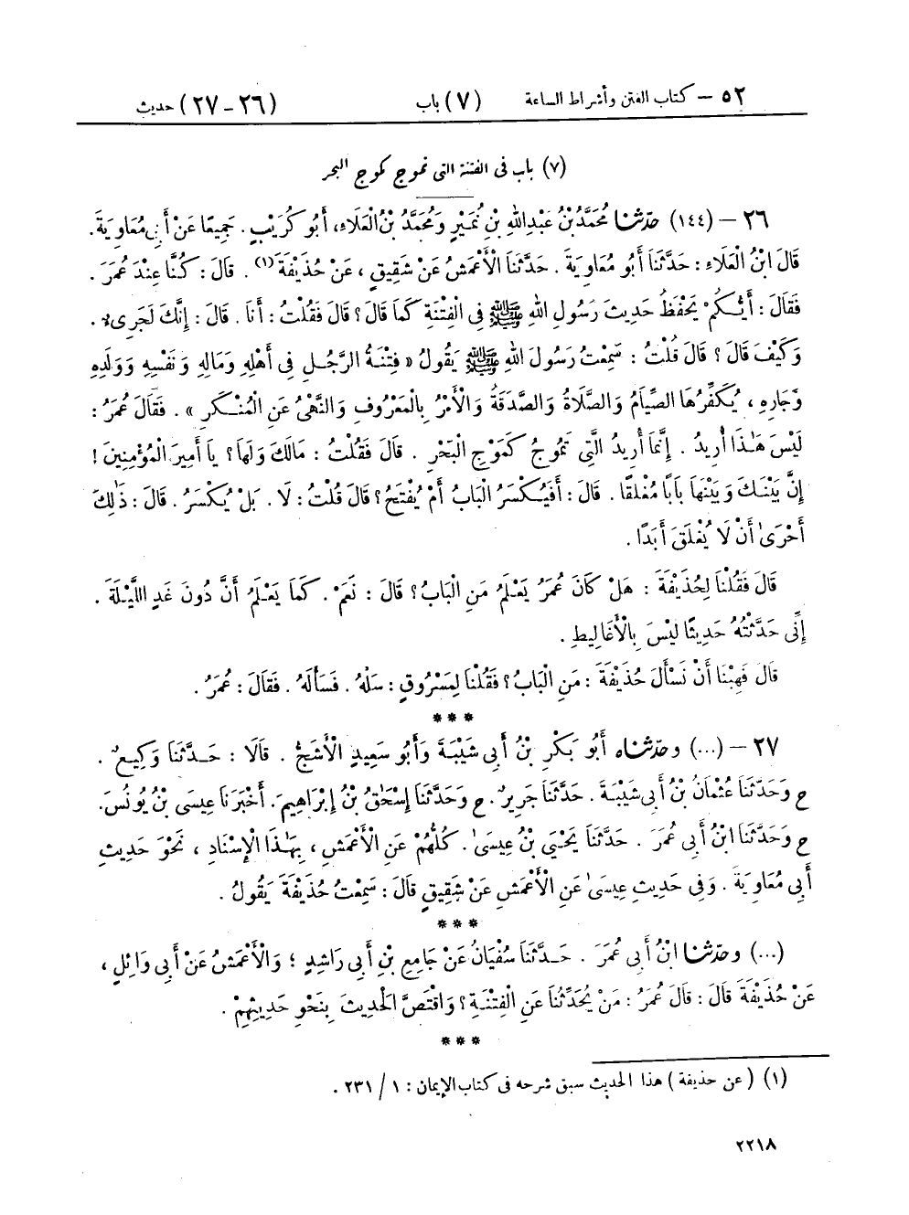 ٢٦ - (١٤٤) حَدَّثَنَا مُحَمَّدُ بْنُ عَبْدِ اللهِ بْنِ نُمَيْرٍ، وَمُحَمَّدُ بْنُ الْعَلَاءِ أَبُو كُرَيْبٍ، جَمِيعًا عَنْ أَبِي مُعَاوِيَةَ، قَالَ ابْنُ الْعَلَاءِ: حَدَّثَنَا أَبُو مُعَاوِيَةَ، حَدَّثَنَا الْأَعْمَشُ، عَنْ شَقِيقٍ، عَنْ حُذَيْفَةَ، قَالَ: كُنَّا عِنْدَ عُمَرَ، فَقَالَ: أَيُّكُمْ يَحْفَظُ حَدِيثَ رَسُولِ اللهِ صَلَّى اللهُ عَلَيْهِ وَسَلَّمَ فِي الْفِتْنَةِ كَمَا قَالَ؟ قَالَ: فَقُلْتُ: أَنَا، قَالَ: إِنَّكَ لَجَرِيءٌ، وَكَيْفَ قَالَ؟ قَالَ: قُلْتُ: سَمِعْتُ رَسُولَ اللهِ صَلَّى اللهُ عَلَيْهِ وَسَلَّمَ يَقُولُ: «فِتْنَةُ الرَّجُلِ فِي أَهْلِهِ وَمَالِهِ وَنَفْسِهِ وَوَلَدِهِ وَجَارِهِ، يُكَفِّرُهَا الصِّيَامُ، وَالصَّلَاةُ، وَالصَّدَقَةُ، وَالْأَمْرُ بِالْمَعْرُوفِ وَالنَّهْيُ عَنِ الْمُنْكَرِ» فَقَالَ عُمَرُ: لَيْسَ هَذَا أُرِيدُ، إِنَّمَا أُرِيدُ الَّتِي تَمُوجُ كَمَوْجِ الْبَحْرِ، قَالَ: فَقُلْتُ: مَا لَكَ وَلَهَا، يَا أَمِيرَ الْمُؤْمِنِينَ؟ إِنَّ بَيْنَكَ وَبَيْنَهَا بَابًا مُغْلَقًا، قَالَ: أَفَيُكْسَرُ الْبَابُ أَمْ يُفْتَحُ؟ قَالَ: قُلْتُ: لَا، بَلْ يُكْسَرُ، قَالَ: ذَلِكَ أَحْرَى أَنْ لَا يُغْلَقَ أَبَدًا، قَالَ: فَقُلْنَا لِحُذَيْفَةَ: هَلْ كَانَ عُمَرُ يَعْلَمُ مَنِ الْبَابُ؟ قَالَ: نَعَمْ، كَمَا يَعْلَمُ أَنَّ دُونَ غَدٍ اللَّيْلَةَ، إِنِّي حَدَّثْتُهُ حَدِيثًا لَيْسَ بِالْأَغَالِيطِ، قَالَ: فَهِبْنَا أَنْ نَسْأَلَ حُذَيْفَةَ: مَنِ الْبَابُ؟ فَقُلْنَا لِمَسْرُوقٍ: سَلْهُ فَسَأَلَهُ، فَقَالَ: عُمَرُ،