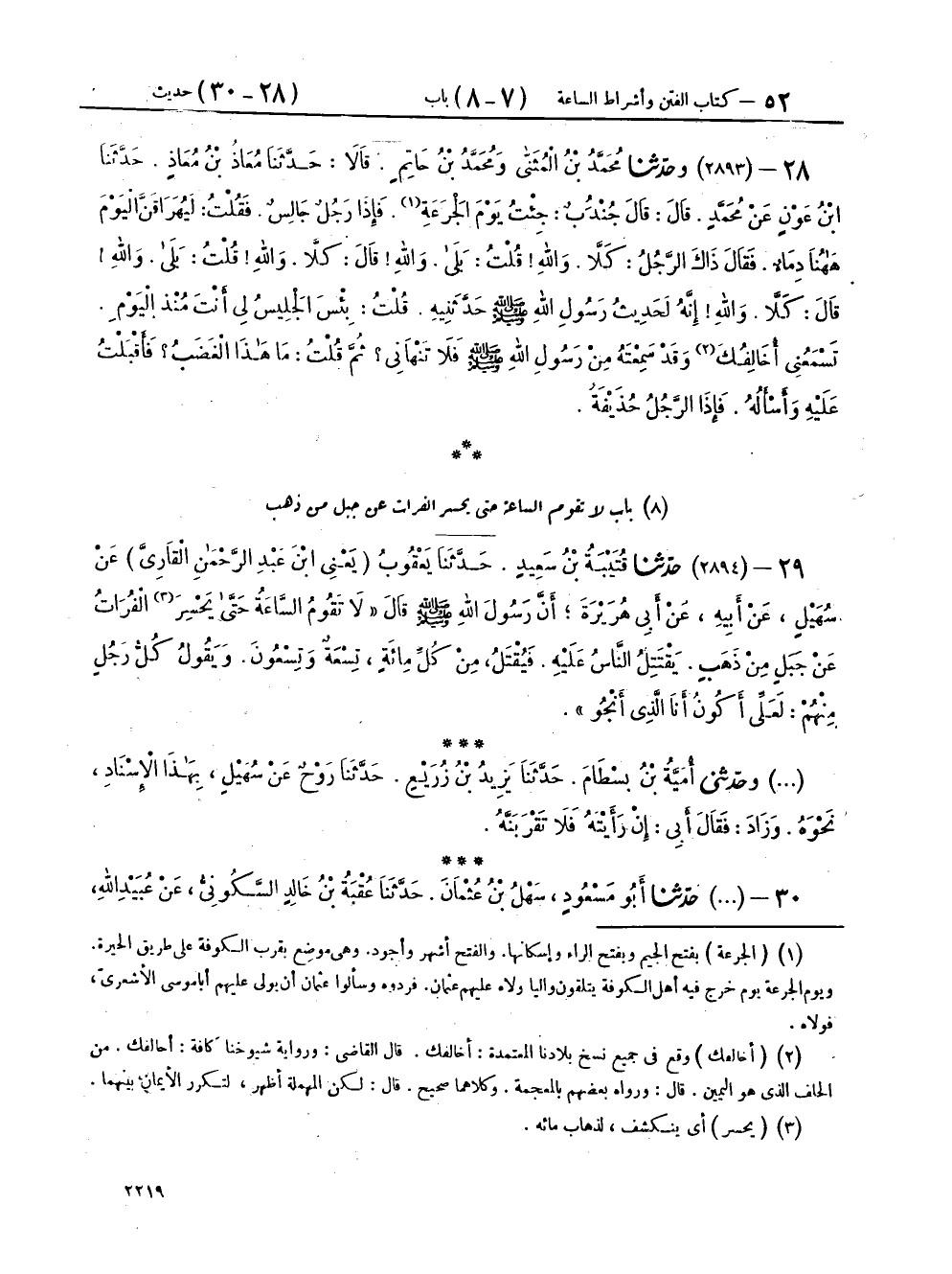 ٢٨ - (٢٨٩٣) وَحَدَّثَنَا مُحَمَّدُ بْنُ الْمُثَنَّى، وَمُحَمَّدُ بْنُ حَاتِمٍ، قَالَا: حَدَّثَنَا مُعَاذُ بْنُ مُعَاذٍ، حَدَّثَنَا ابْنُ عَوْنٍ، عَنْ مُحَمَّدٍ، قَالَ: قَالَ جُنْدُبٌ: جِئْتُ يَوْمَ الْجَرَعَةِ، فَإِذَا رَجُلٌ جَالِسٌ، فَقُلْتُ: لَيُهْرَاقَنَّ الْيَوْمَ هَاهُنَا دِمَاءٌ، فَقَالَ ذَاكَ الرَّجُلُ: «كَلَّا، وَاللهِ» قُلْتُ: بَلَى، وَاللهِ قَالَ: «كَلَّا، وَاللهِ» قُلْتُ: بَلَى، وَاللهِ قَالَ: «كَلَّا، وَاللهِ إِنَّهُ لَحَدِيثُ رَسُولِ اللهِ صَلَّى اللهُ عَلَيْهِ وَسَلَّمَ حَدَّثَنِيهِ»، قُلْتُ: بِئْسَ الْجَلِيسُ لِي أَنْتَ مُنْذُ الْيَوْمِ، تَسْمَعُنِي أُخَالِفُكَ وَقَدْ سَمِعْتَهُ مِنْ رَسُولِ اللهِ صَلَّى اللهُ عَلَيْهِ وَسَلَّمَ فَلَا تَنْهَانِي، ثُمَّ قُلْتُ: مَا هَذَا الْغَضَبُ؟ فَأَقْبَلْتُ عَلَيْهِ وَأَسْأَلُهُ، فَإِذَا الرَّجُلُ حُذَيْفَةُ