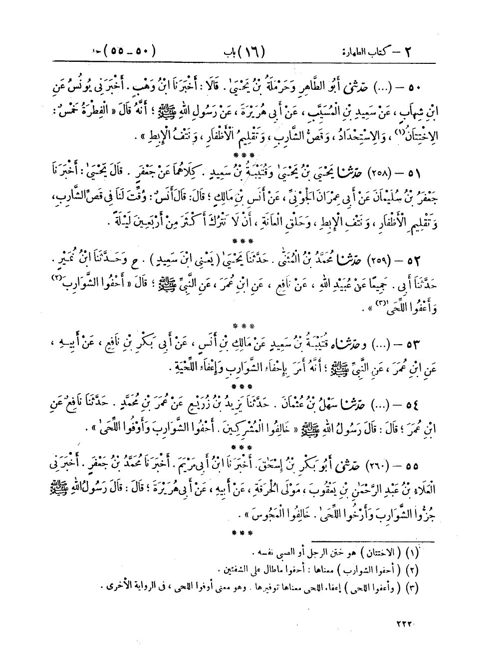 [ ش (أحفوا الشوارب) معناها أحفوا ما طال على الشفتين (وأعفوا اللحى) إعفاء اللحى معناها توفيرها وهو معنى أوفوا اللحى في الرواية الأخرى]