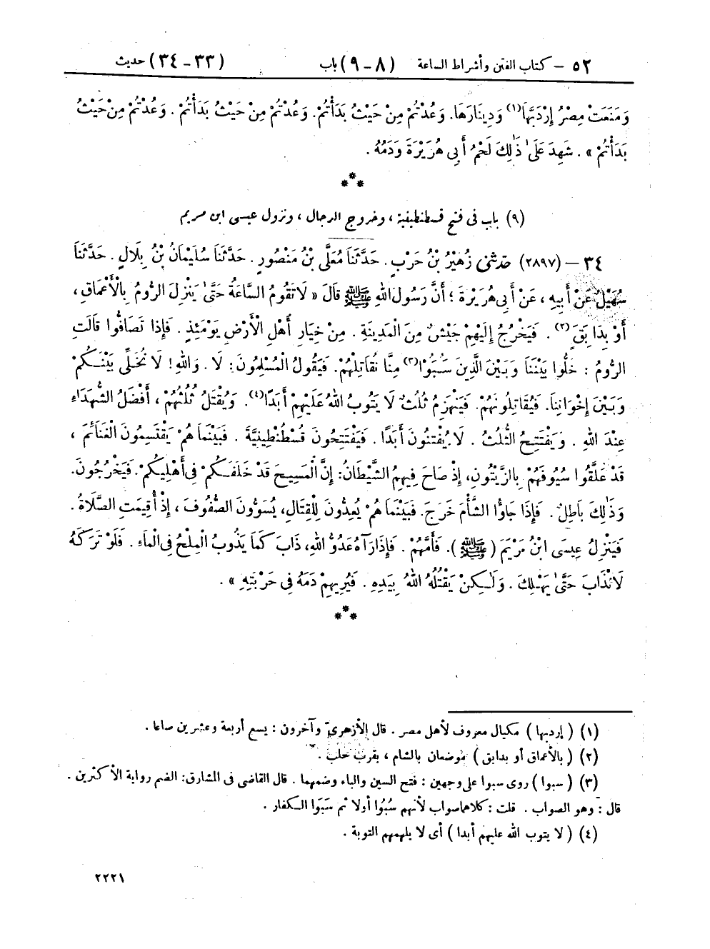 ٩ - بَابٌ فِي فَتْحِ قُسْطَنْطِينِيَّةَ، وَخُرُوجِ الدَّجَّالِ وَنُزُولِ عِيسَى ابْنِ مَرْيَمَ