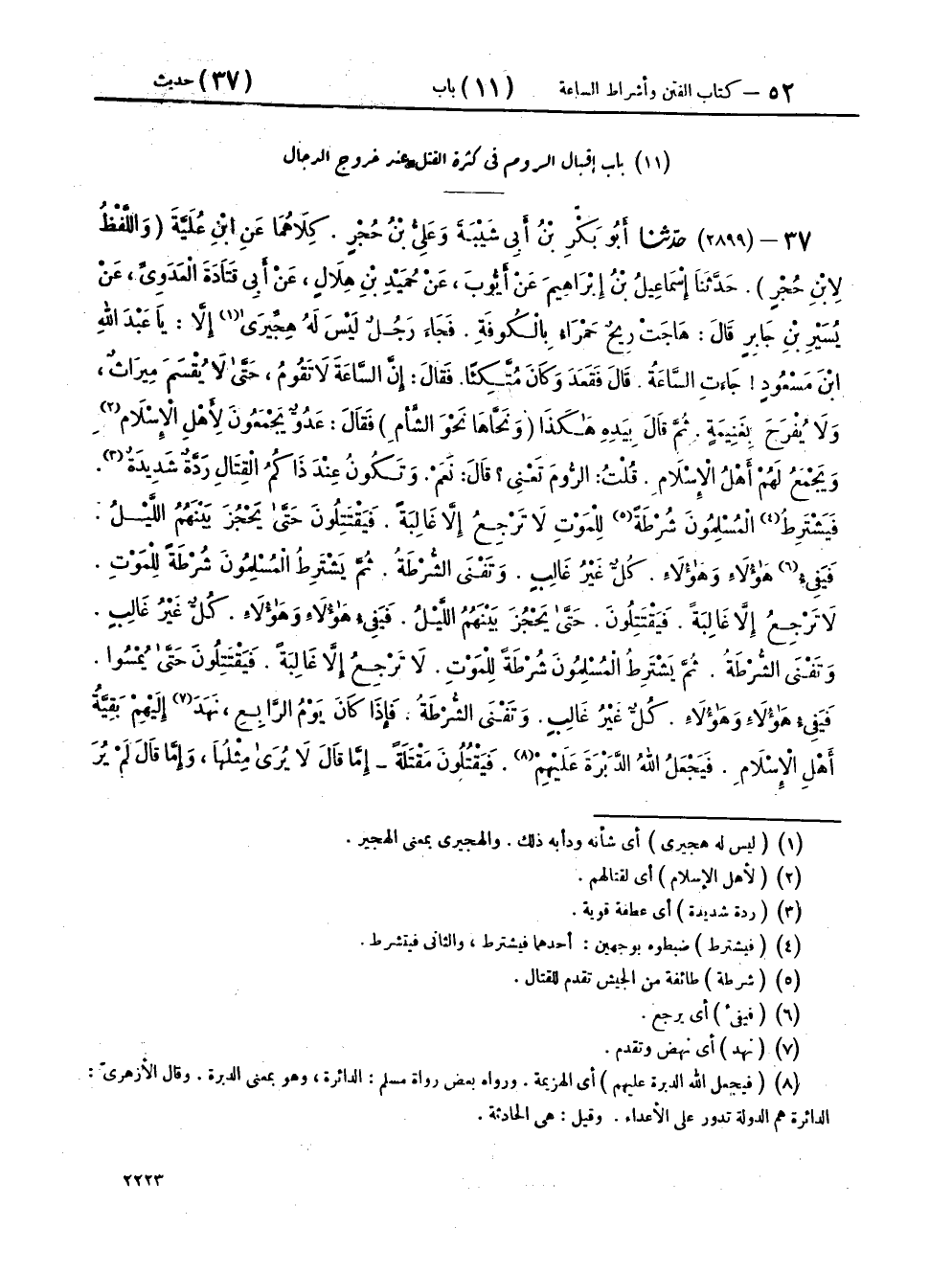 ٣٧ - (٢٨٩٩) حَدَّثَنَا أَبُو بَكْرِ بْنُ أَبِي شَيْبَةَ، وَعَلِيُّ بْنُ حُجْرٍ، كِلَاهُمَا عَنِ ابْنِ عُلَيَّةَ - وَاللَّفْظُ لِابْنِ حُجْرٍ - حَدَّثَنَا إِسْمَاعِيلُ بْنُ إِبْرَاهِيمَ، عَنْ أَيُّوبَ، عَنْ حُمَيْدِ بْنِ هِلَالٍ، عَنْ أَبِي قَتَادَةَ الْعَدَوِيِّ، عَنْ يُسَيْرِ بْنِ جَابِرٍ، قَالَ: هَاجَتْ رِيحٌ حَمْرَاءُ بِالْكُوفَةِ، فَجَاءَ رَجُلٌ لَيْسَ لَهُ هِجِّيرَى إِلَّا: يَا عَبْدَ اللهِ بْنَ مَسْعُودٍ جَاءَتِ السَّاعَةُ، قَالَ: فَقَعَدَ وَكَانَ مُتَّكِئًا، فَقَالَ: إِنَّ السَّاعَةَ لَا تَقُومُ، حَتَّى لَا يُقْسَمَ مِيرَاثٌ، وَلَا يُفْرَحَ بِغَنِيمَةٍ، ثُمَّ قَالَ: بِيَدِهِ هَكَذَا - وَنَحَّاهَا نَحْوَ الشَّأْمِ - فَقَالَ: عَدُوٌّ يَجْمَعُونَ لِأَهْلِ الْإِسْلَامِ، وَيَجْمَعُ لَهُمْ أَهْلُ الْإِسْلَامِ، قُلْتُ: الرُّومَ تَعْنِي؟ قَالَ: نَعَمْ، وَتَكُونُ عِنْدَ ذَاكُمُ الْقِتَالِ رَدَّةٌ شَدِيدَةٌ، فَيَشْتَرِطُ الْمُسْلِمُونَ شُرْطَةً لِلْمَوْتِ لَا تَرْجِعُ إِلَّا غَالِبَةً، فَيَقْتَتِلُونَ حَتَّى يَحْجُزَ بَيْنَهُمُ اللَّيْلُ، فَيَفِيءُ هَؤُلَاءِ وَهَؤُلَاءِ، كُلٌّ غَيْرُ غَالِبٍ، وَتَفْنَى الشُّرْطَةُ، ثُمَّ يَشْتَرِطُ الْمُسْلِمُونَ شُرْطَةً لِلْمَوْتِ، لَا تَرْجِعُ إِلَّا غَالِبَةً، فَيَقْتَتِلُونَ حَتَّى يَحْجُزَ بَيْنَهُمُ اللَّيْلُ، فَيَفِيءُ هَؤُلَاءِ وَهَؤُلَاءِ، كُلٌّ غَيْرُ غَالِبٍ، وَتَفْنَى الشُّرْطَةُ، ثُمَّ يَشْتَرِطُ الْمُسْلِمُونَ شُرْطَةً لِلْمَوْتِ، لَا تَرْجِعُ إِلَّا غَالِبَةً، فَيَقْتَتِلُونَ حَتَّى يُمْسُوا، فَيَفِيءُ هَؤُلَاءِ وَهَؤُلَاءِ، كُلٌّ غَيْرُ غَالِبٍ، وَتَفْنَى الشُّرْطَةُ، فَإِذَا كَانَ يَوْمُ الرَّابِعِ، نَهَدَ إِلَيْهِمْ بَقِيَّةُ أَهْلِ الْإِسْلَامِ، فَيَجْعَلُ اللهُ الدَّبْرَةَ عَلَيْهِمْ، فَيَقْتُلُونَ مَقْتَلَةً - إِمَّا قَالَ لَا يُرَى مِثْلُهَا، وَإِمَّا قَالَ لَمْ يُرَ مِثْلُهَا - حَتَّى إِنَّ الطَّائِرَ لَيَمُرُّ بِجَنَبَاتِهِمْ، فَمَا يُخَلِّفُهُمْ حَتَّى يَخِرَّ مَيْتًا، فَيَتَعَادُّ بَنُو الْأَبِ، كَانُوا مِائَةً، فَلَا يَجِدُونَهُ بَقِيَ مِنْهُمْ إِلَّا الرَّجُلُ الْوَاحِدُ، فَبِأَيِّ غَنِيمَةٍ يُفْرَحُ؟ أَوْ أَيُّ مِيرَاثٍ يُقَاسَمُ، فَبَيْنَمَا هُمْ كَذَلِكَ إِذْ سَمِعُوا بِبَأْسٍ، هُوَ أَكْبَرُ مِنْ ذَلِكَ، فَجَاءَهُمُ الصَّرِيخُ، إِنَّ الدَّجَّالَ قَدْ خَلَفَهُمْ فِي ذَرَارِيِّهِمْ، فَيَرْفُضُونَ مَا فِي أَيْدِيهِمْ، وَيُقْبِلُونَ، فَيَبْعَثُونَ عَشَرَةَ فَوَارِسَ طَلِيعَةً، قَالَ رَسُولُ اللهِ صَلَّى اللهُ عَلَيْهِ وَسَلَّمَ: «إِنِّي لَأَعْرِفُ أَسْمَاءَهُمْ وَأَسْمَاءَ آبَائِهِمْ، وَأَلْوَانَ خُيُولِهِمْ، هُمْ خَيْرُ فَوَارِسَ عَلَى ظَهْرِ الْأَرْضِ يَوْمَئِذٍ - أَوْ مِنْ خَيْرِ فَوَارِسَ عَلَى ظَهْرِ الْأَرْضِ يَوْمَئِذٍ -» قَالَ ابْنُ أَبِي شَيْبَةَ فِي رِوَايَتِهِ: عَنْ أُسَيْرِ بْنِ جَابِرٍ،