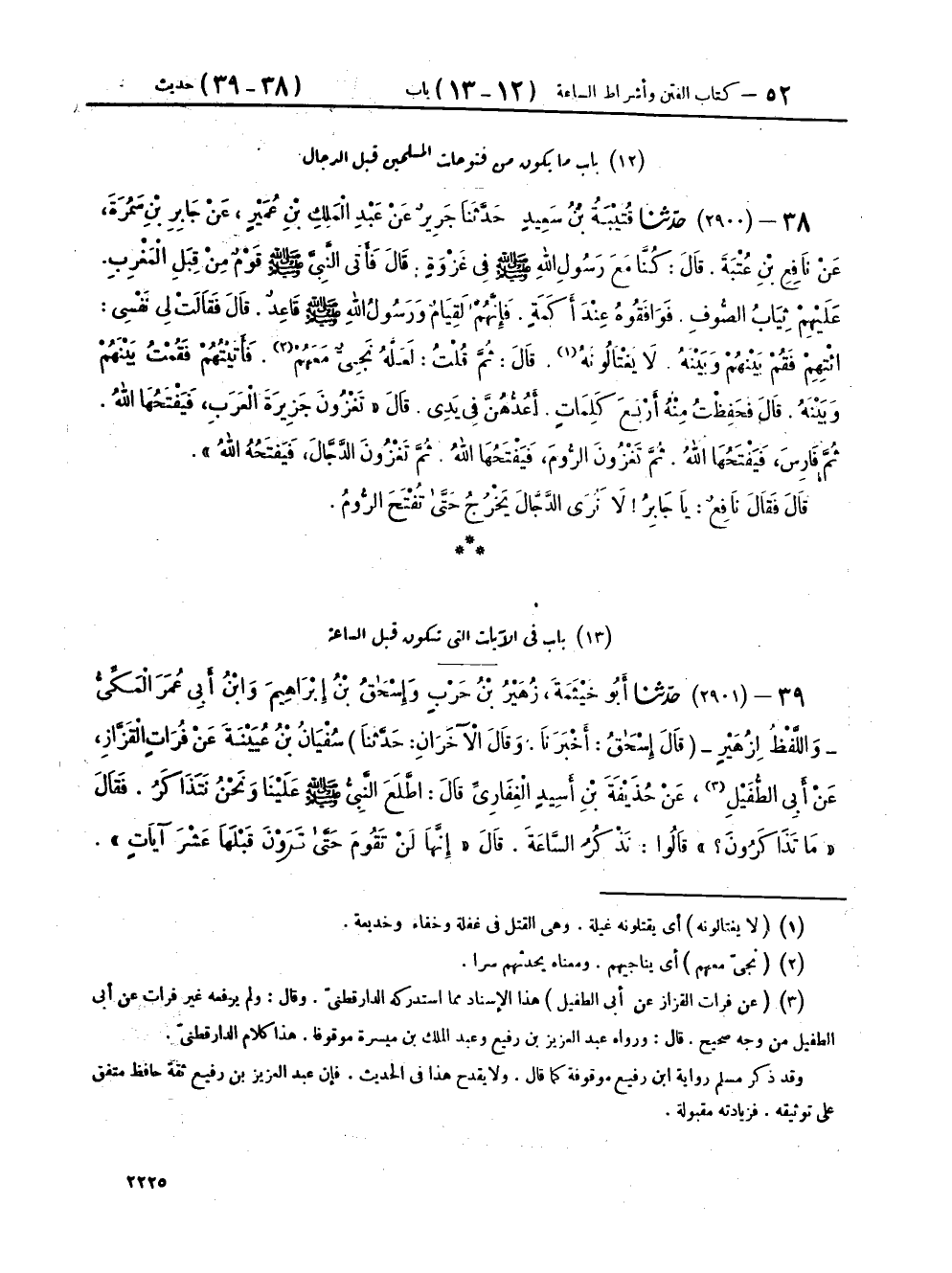 ٣٨ - (٢٩٠٠) حَدَّثَنَا قُتَيْبَةُ بْنُ سَعِيدٍ، حَدَّثَنَا جَرِيرٌ، عَنْ عَبْدِ الْمَلِكِ بْنِ عُمَيْرٍ، عَنْ جَابِرِ بْنِ سَمُرَةَ، عَنْ نَافِعِ بْنِ عُتْبَةَ، قَالَ: كُنَّا مَعَ رَسُولِ اللهِ صَلَّى اللهُ عَلَيْهِ وَسَلَّمَ، فِي غَزْوَةٍ، قَالَ: فَأَتَى النَّبِيَّ صَلَّى اللهُ عَلَيْهِ وَسَلَّمَ، قَوْمٌ مِنْ قِبَلِ الْمَغْرِبِ، عَلَيْهِمْ ثِيَابُ الصُّوفِ، فَوَافَقُوهُ عِنْدَ أَكَمَةٍ، فَإِنَّهُمْ لَقِيَامٌ وَرَسُولُ اللهِ صَلَّى اللهُ عَلَيْهِ وَسَلَّمَ قَاعِدٌ، قَالَ: فَقَالَتْ لِي نَفْسِي: ائْتِهِمْ فَقُمْ بَيْنَهُمْ وَبَيْنَهُ لَا يَغْتَالُونَهُ، قَالَ: ثُمَّ قُلْتُ: لَعَلَّهُ نَجِيٌّ مَعَهُمْ، فَأَتَيْتُهُمْ فَقُمْتُ بَيْنَهُمْ وَبَيْنَهُ، قَالَ: فَحَفِظْتُ مِنْهُ أَرْبَعَ كَلِمَاتٍ، أَعُدُّهُنَّ فِي يَدِي، قَالَ: «تَغْزُونَ جَزِيرَةَ الْعَرَبِ فَيَفْتَحُهَا اللهُ، ثُمَّ فَارِسَ فَيَفْتَحُهَا اللهُ، ثُمَّ تَغْزُونَ الرُّومَ فَيَفْتَحُهَا اللهُ، ثُمَّ تَغْزُونَ الدَّجَّالَ فَيَفْتَحُهُ اللهُ» قَالَ: فَقَالَ نَافِعٌ: يَا جَابِرُ، لَا نَرَى الدَّجَّالَ يَخْرُجُ، حَتَّى تُفْتَحَ الرُّومُ