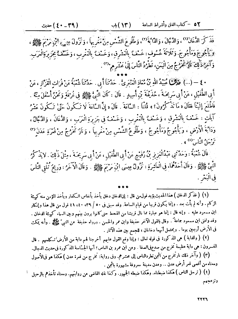 ٤٠ - (٢٩٠١) حَدَّثَنَا عُبَيْدُ اللهِ بْنُ مُعَاذٍ الْعَنْبَرِيُّ، حَدَّثَنَا أَبِي، حَدَّثَنَا شُعْبَةُ، عَنْ فُرَاتٍ الْقَزَّازِ، عَنْ أَبِي الطُّفَيْلِ، عَنْ أَبِي سَرِيحَةَ حُذَيْفَةَ بْنِ أَسِيدٍ، قَالَ: كَانَ النَّبِيُّ صَلَّى اللهُ عَلَيْهِ وَسَلَّمَ فِي غُرْفَةٍ وَنَحْنُ أَسْفَلَ مِنْهُ، فَاطَّلَعَ إِلَيْنَا، فَقَالَ: مَا تَذْكُرُونَ؟ " قُلْنَا: السَّاعَةَ، قَالَ: " إِنَّ السَّاعَةَ لَا تَكُونُ حَتَّى تَكُونَ عَشْرُ آيَاتٍ: خَسْفٌ بِالْمَشْرِقِ، وَخَسْفٌ بِالْمَغْرِبِ، وَخَسْفٌ فِي جَزِيرَةِ الْعَرَبِ وَالدُّخَانُ وَالدَّجَّالُ، وَدَابَّةُ الْأَرْضِ، وَيَأْجُوجُ وَمَأْجُوجُ، وَطُلُوعُ الشَّمْسِ مِنْ مَغْرِبِهَا، وَنَارٌ تَخْرُجُ مِنْ قُعْرَةِ عَدَنٍ تَرْحَلُ النَّاسَ " قَالَ شُعْبَةُ: وَحَدَّثَنِي عَبْدُ الْعَزِيزِ بْنُ رُفَيْعٍ، عَنْ أَبِي الطُّفَيْلِ، عَنْ أَبِي سَرِيحَةَ، مِثْلَ ذَلِكَ، لَا يَذْكُرُ النَّبِيَّ صَلَّى اللهُ عَلَيْهِ وَسَلَّمَ، وقَالَ أَحَدُهُمَا فِي الْعَاشِرَةِ: نُزُولُ عِيسَى ابْنِ مَرْيَمَ صَلَّى اللهُ عَلَيْهِ وَسَلَّمَ، وقَالَ الْآخَرُ: وَرِيحٌ تُلْقِي النَّاسَ فِي الْبَحْرِ،