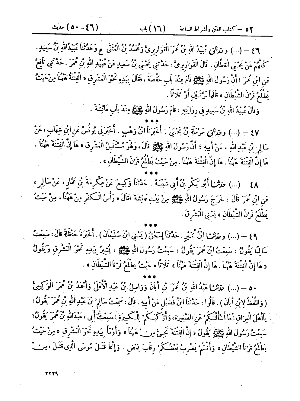 ٤٩ - (٢٩٠٥) وَحَدَّثَنَا ابْنُ نُمَيْرٍ، حَدَّثَنَا إِسْحَاقُ يَعْنِي ابْنَ سُلَيْمَانَ، أَخْبَرَنَا حَنْظَلَةُ، قَالَ: سَمِعْتُ سَالِمًا، يَقُولُ: سَمِعْتُ ابْنَ عُمَرَ، يَقُولُ: سَمِعْتُ رَسُولَ اللهِ صَلَّى اللهُ عَلَيْهِ وَسَلَّمَ، يُشِيرُ بِيَدِهِ نَحْوَ الْمَشْرِقِ، وَيَقُولُ: «هَا إِنَّ الْفِتْنَةَ هَاهُنَا، هَا إِنَّ الْفِتْنَةَ هَاهُنَا» ثَلَاثًا «حَيْثُ يَطْلُعُ قَرْنَا الشَّيْطَانِ»