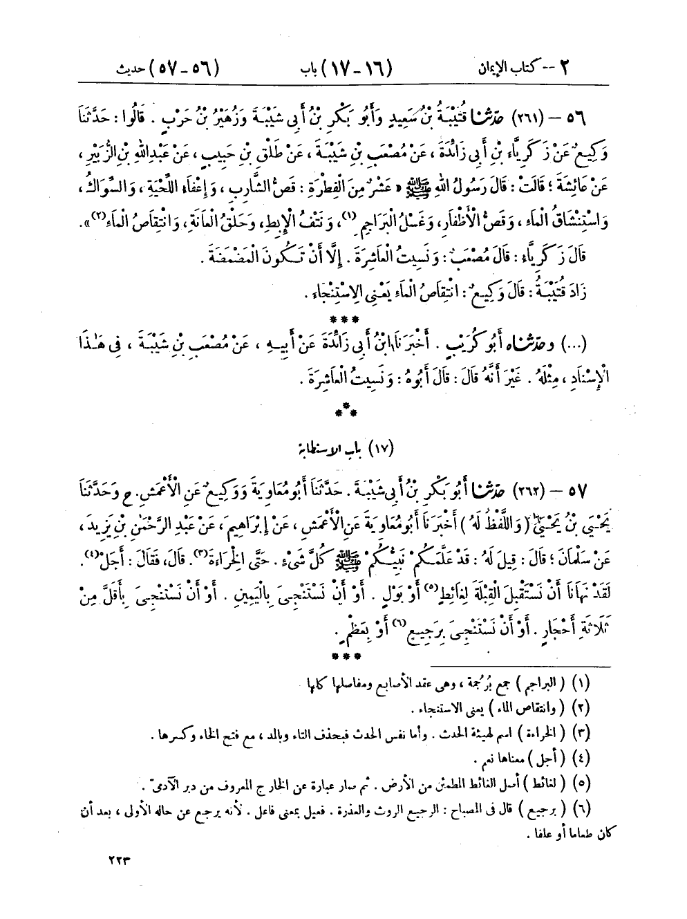 ٥٦ - (٢٦١) حَدَّثَنَا قُتَيْبَةُ بْنُ سَعِيدٍ، وَأَبُو بَكْرِ بْنُ أَبِي شَيْبَةَ، وَزُهَيْرُ بْنُ حَرْبٍ، قَالُوا: حَدَّثَنَا وَكِيعٌ، عَنْ زَكَرِيَّا بْنِ أَبِي زَائِدَةَ، عَنْ مُصْعَبِ بْنِ شَيْبَةَ، عَنْ طَلْقِ بْنِ حَبِيبٍ، عَنْ عَبْدِ اللهِ بْنِ الزُّبَيْرِ، عَنْ عَائِشَةَ، قَالَتْ: قَالَ رَسُولُ اللهِ صَلَّى اللهُ عَلَيْهِ وَسَلَّمَ: " عَشْرٌ مِنَ الْفِطْرَةِ: قَصُّ الشَّارِبِ، وَإِعْفَاءُ اللِّحْيَةِ، وَالسِّوَاكُ، وَاسْتِنْشَاقُ الْمَاءِ، وَقَصُّ الْأَظْفَارِ، وَغَسْلُ الْبَرَاجِمِ، وَنَتْفُ الْإِبِطِ، وَحَلْقُ الْعَانَةِ، وَانْتِقَاصُ الْمَاءِ " قَالَ زَكَرِيَّا: قَالَ مُصْعَبٌ: وَنَسِيتُ الْعَاشِرَةَ إِلَّا أَنْ تَكُونَ الْمَضْمَضَةَ زَادَ قُتَيْبَةُ، قَالَ وَكِيعٌ: " انْتِقَاصُ الْمَاءِ: يَعْنِي الِاسْتِنْجَاءَ "