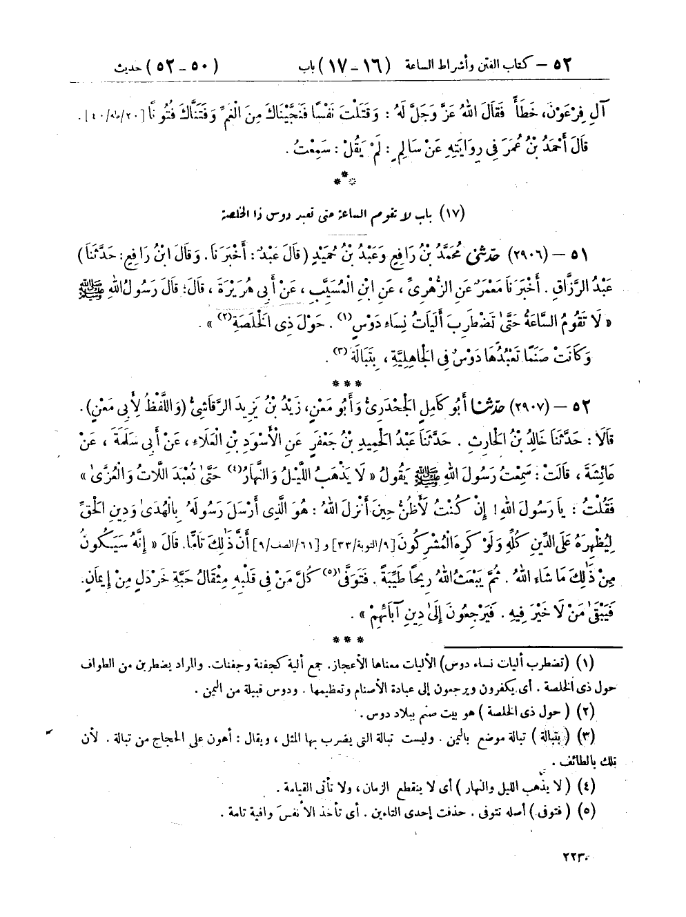 ٥١ - (٢٩٠٦) حَدَّثَنِي مُحَمَّدُ بْنُ رَافِعٍ، وَعَبْدُ بْنُ حُمَيْدٍ - قَالَ عَبْدٌ: أَخْبَرَنَا، وقَالَ ابْنُ رَافِعٍ: حَدَّثَنَا - عَبْدُ الرَّزَّاقِ، أَخْبَرَنَا مَعْمَرٌ، عَنِ الزُّهْرِيِّ، عَنِ ابْنِ الْمُسَيِّبِ، عَنْ أَبِي هُرَيْرَةَ، قَالَ: قَالَ رَسُولُ اللهِ صَلَّى اللهُ عَلَيْهِ وَسَلَّمَ: «لَا تَقُومُ السَّاعَةُ حَتَّى تَضْطَرِبَ أَلَيَاتُ نِسَاءِ دَوْسٍ، حَوْلَ ذِي الْخَلَصَةِ» وَكَانَتْ صَنَمًا تَعْبُدُهَا دَوْسٌ فِي الْجَاهِلِيَّةِ بِتَبَالَةَ