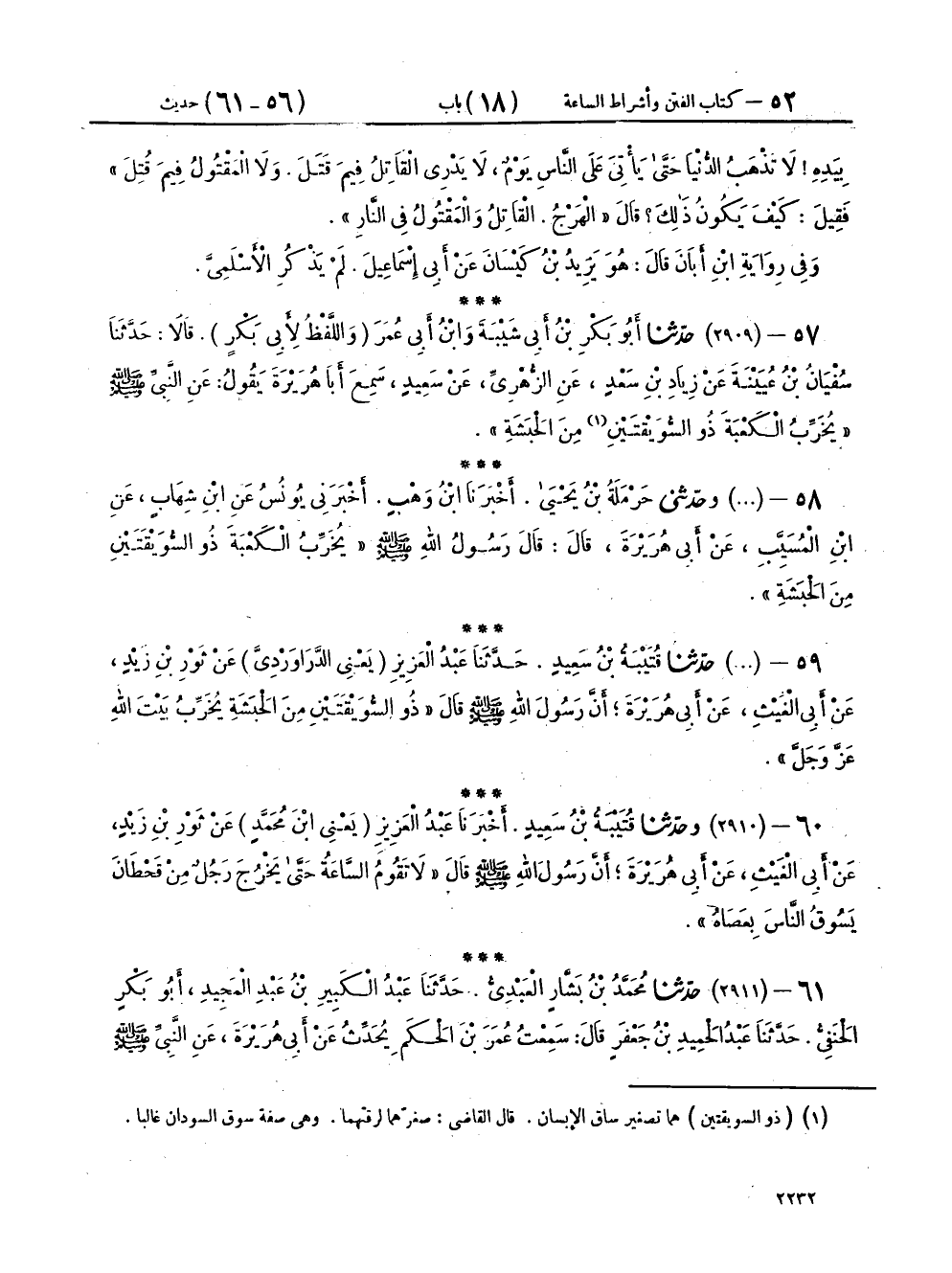 ٥٧ - (٢٩٠٩) حَدَّثَنَا أَبُو بَكْرِ بْنُ أَبِي شَيْبَةَ، وَابْنُ أَبِي عُمَرَ - وَاللَّفْظُ لِأَبِي بَكْرٍ قَالَا: حَدَّثَنَا سُفْيَانُ بْنُ عُيَيْنَةَ، عَنْ زِيَادِ بْنِ سَعْدٍ، عَنِ الزُّهْرِيِّ، عَنْ سَعِيدٍ، سَمِعَ أَبَا هُرَيْرَةَ، يَقُولُ: عَنِ النَّبِيِّ صَلَّى اللهُ عَلَيْهِ وَسَلَّمَ، «يُخَرِّبُ الْكَعْبَةَ ذُو السُّوَيْقَتَيْنِ مِنَ الْحَبَشَةِ»