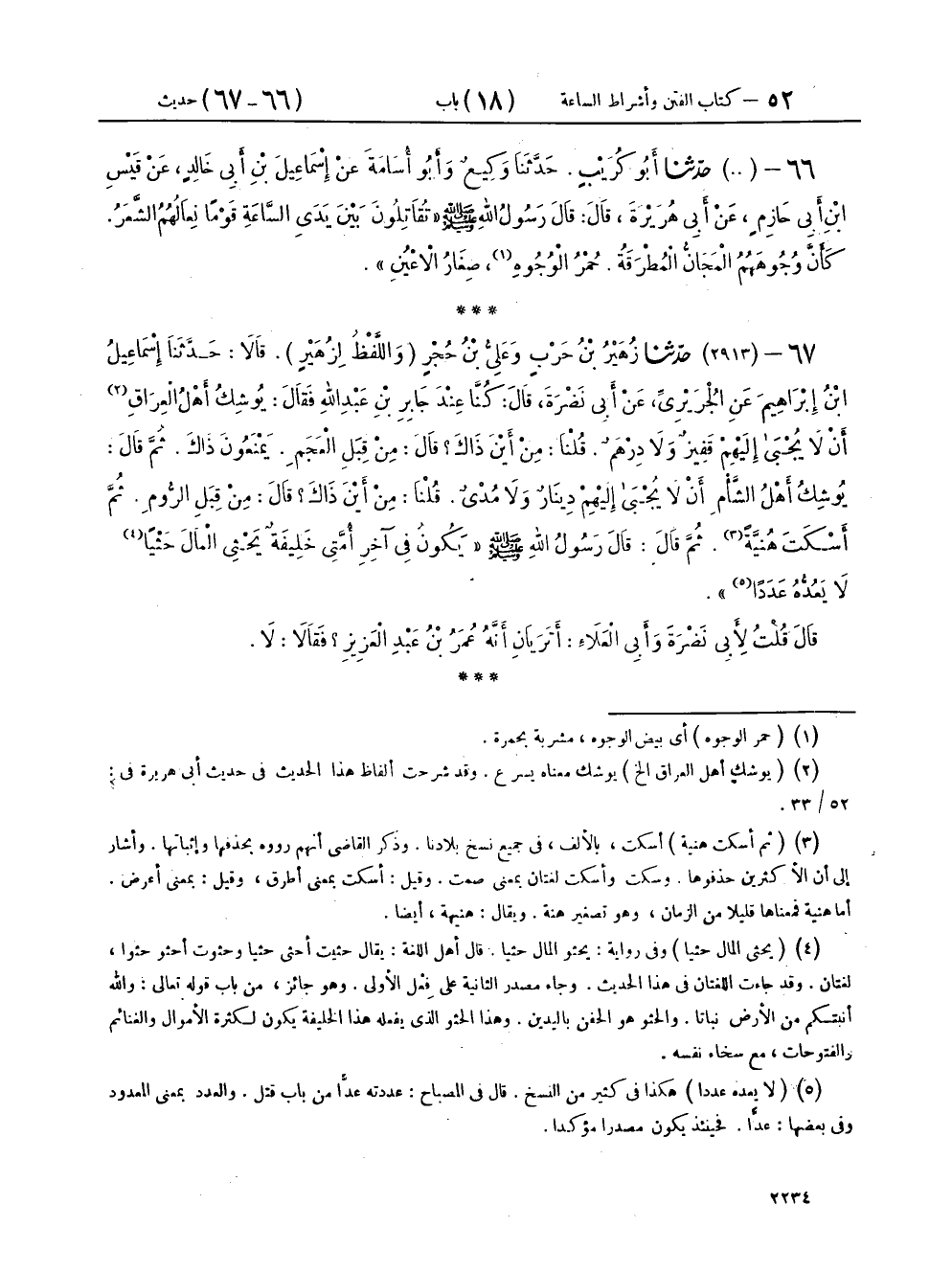 ٦٦ - (٢٩١٢) حَدَّثَنَا أَبُو كُرَيْبٍ، حَدَّثَنَا وَكِيعٌ، وَأَبُو أُسَامَةَ، عَنْ إِسْمَاعِيلَ بْنِ أَبِي خَالِدٍ، عَنْ قَيْسِ بْنِ أَبِي حَازِمٍ، عَنْ أَبِي هُرَيْرَةَ، قَالَ: قَالَ رَسُولُ اللهِ صَلَّى اللهُ عَلَيْهِ وَسَلَّمَ: «تُقَاتِلُونَ بَيْنَ يَدَيِ السَّاعَةِ قَوْمًا نِعَالُهُمُ الشَّعَرُ، كَأَنَّ وُجُوهَهُمُ الْمَجَانُّ الْمُطْرَقَةُ، حُمْرُ الْوُجُوهِ، صِغَارُ الْأَعْيُنِ»