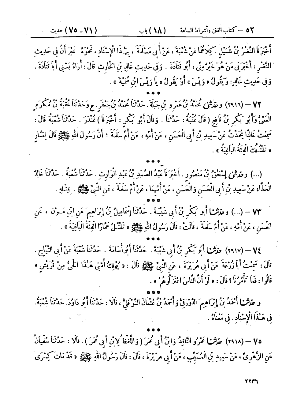 ٧٤ - (٢٩١٧) حَدَّثَنَا أَبُو بَكْرِ بْنُ أَبِي شَيْبَةَ، حَدَّثَنَا أَبُو أُسَامَةَ، حَدَّثَنَا شُعْبَةُ، عَنْ أَبِي التَّيَّاحِ، قَالَ: سَمِعْتُ أَبَا زُرْعَةَ، عَنْ أَبِي هُرَيْرَةَ، عَنِ النَّبِيِّ صَلَّى اللهُ عَلَيْهِ وَسَلَّمَ، قَالَ: «يُهْلِكُ أُمَّتِي هَذَا الْحَيُّ مِنْ قُرَيْشٍ» قَالُوا: فَمَا تَأْمُرُنَا؟ قَالَ: «لَوْ أَنَّ النَّاسَ اعْتَزَلُوهُمْ»، وَحَدَّثَنَا أَحْمَدُ بْنُ إِبْرَاهِيمَ الدَّوْرَقِيُّ، وَأَحْمَدُ بْنُ عُثْمَانَ النَّوْفَلِيُّ، قَالَا: حَدَّثَنَا أَبُو دَاوُدَ، حَدَّثَنَا شُعْبَةُ، فِي هَذَا الْإِسْنَادِ فِي مَعْنَاهُ