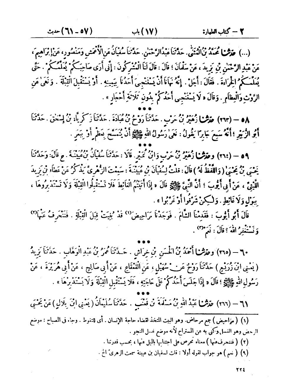 ٥٩ - (٢٦٤) وَحَدَّثَنَا زُهَيْرُ بْنُ حَرْبٍ، وَابْنُ نُمَيْرٍ، قَالَا: حَدَّثَنَا سُفْيَانُ بْنُ عُيَيْنَةَ ح، قَالَ: وَحَدَّثَنَا يَحْيَى بْنُ يَحْيَى، - وَاللَّفْظُ لَهُ - قَالَ: قُلْتُ لِسُفْيَانَ بْنِ عُيَيْنَةَ، سَمِعْتَ الزُّهْرِيَّ، يَذْكُرُ عَنْ عَطَاءِ بْنِ يَزِيدَ اللَّيْثِيِّ، عَنْ أَبِي أَيُّوبَ، أَنَّ النَّبِيَّ صَلَّى اللهُ عَلَيْهِ وَسَلَّمَ قَالَ: «إِذَا أَتَيْتُمُ الْغَائِطَ فَلَا تَسْتَقْبِلُوا الْقِبْلَةَ، وَلَا تَسْتَدْبِرُوهَا بِبَوْلٍ وَلَا غَائِطٍ، وَلَكِنْ شَرِّقُوا أَوْ غَرِّبُوا» قَالَ أَبُو أَيُّوبَ: " فَقَدِمْنَا الشَّامَ فَوَجَدْنَا مَرَاحِيضَ قَدْ بُنِيَتْ قِبَلَ الْقِبْلَةِ، فَنَنْحَرِفُ عَنْهَا وَنَسْتَغْفِرُ اللهَ؟ قَالَ: نَعَمْ