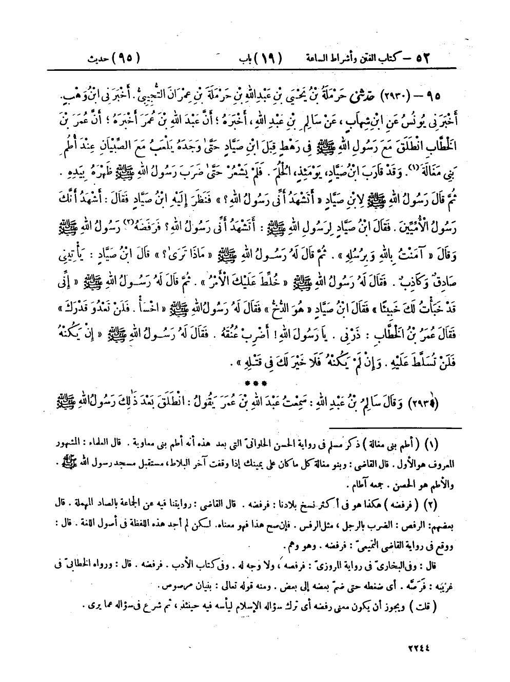 ٩٥ - (٢٩٣٠) حَدَّثَنِي حَرْمَلَةُ بْنُ يَحْيَى بْنِ عَبْدِ اللهِ بْنِ حَرْمَلَةَ بْنِ عِمْرَانَ التُّجِيبِيُّ، أَخْبَرَنِي ابْنُ وَهْبٍ، أَخْبَرَنِي يُونُسُ، عَنِ ابْنِ شِهَابٍ، عَنْ سَالِمِ بْنِ عَبْدِ اللهِ، أَخْبَرَهُ أَنَّ عَبْدَ اللهِ بْنَ عُمَرَ، أَخْبَرَهُ أَنَّ عُمَرَ بْنَ الْخَطَّابِ انْطَلَقَ مَعَ رَسُولِ اللهِ صَلَّى اللهُ عَلَيْهِ وَسَلَّمَ فِي رَهْطٍ قِبَلَ ابْنِ صَيَّادٍ حَتَّى وَجَدَهُ يَلْعَبُ مَعَ الصِّبْيَانِ عِنْدَ أُطُمِ بَنِي مَغَالَةَ، وَقَدْ قَارَبَ ابْنُ صَيَّادٍ يَوْمَئِذٍ الْحُلُمَ، فَلَمْ يَشْعُرْ حَتَّى ضَرَبَ رَسُولُ اللهِ صَلَّى اللهُ عَلَيْهِ وَسَلَّمَ ظَهْرَهُ بِيَدِهِ، ثُمَّ قَالَ رَسُولُ اللهِ صَلَّى اللهُ عَلَيْهِ وَسَلَّمَ لِابْنِ صَيَّادٍ: «أَتَشْهَدُ أَنِّي رَسُولُ اللهِ؟» فَنَظَرَ إِلَيْهِ ابْنُ صَيَّادٍ، فَقَالَ: أَشْهَدُ أَنَّكَ رَسُولُ الْأُمِّيِّينَ، فَقَالَ ابْنُ صَيَّادٍ لِرَسُولِ اللهِ صَلَّى اللهُ عَلَيْهِ وَسَلَّمَ: أَتَشْهَدُ أَنِّي رَسُولُ اللهِ؟ فَرَفَضَهُ رَسُولُ اللهِ صَلَّى اللهُ عَلَيْهِ وَسَلَّمَ، وَقَالَ: «آمَنْتُ بِاللهِ وَبِرُسُلِهِ» ثُمَّ قَالَ لَهُ رَسُولُ اللهِ صَلَّى اللهُ عَلَيْهِ وَسَلَّمَ: «مَاذَا تَرَى؟» قَالَ ابْنُ صَيَّادٍ: يَأْتِينِي صَادِقٌ وَكَاذِبٌ، فَقَالَ لَهُ رَسُولُ اللهِ صَلَّى اللهُ عَلَيْهِ وَسَلَّمَ: «خُلِّطَ عَلَيْكَ الْأَمْرُ» ثُمَّ قَالَ لَهُ رَسُولُ اللهِ صَلَّى اللهُ عَلَيْهِ وَسَلَّمَ: «إِنِّي قَدْ خَبَأْتُ لَكَ خَبِيئًا» فَقَالَ ابْنُ صَيَّادٍ: هُوَ الدُّخُّ، فَقَالَ لَهُ رَسُولُ اللهِ صَلَّى اللهُ عَلَيْهِ وَسَلَّمَ: «اخْسَأْ، فَلَنْ تَعْدُوَ قَدْرَكَ» فَقَالَ عُمَرُ بْنُ الْخَطَّابِ: ذَرْنِي، يَا رَسُولَ اللهِ أَضْرِبْ عُنُقَهُ، فَقَالَ لَهُ رَسُولُ اللهِ صَلَّى اللهُ عَلَيْهِ وَسَلَّمَ: «إِنْ يَكُنْهُ فَلَنْ تُسَلَّطَ عَلَيْهِ، وَإِنْ لَمْ يَكُنْهُ فَلَا خَيْرَ لَكَ فِي قَتْلِهِ»