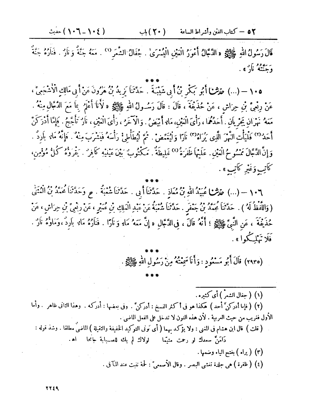 ١٠٥ - (٢٩٣٤) حَدَّثَنَا أَبُو بَكْرِ بْنُ أَبِي شَيْبَةَ، حَدَّثَنَا يَزِيدُ بْنُ هَارُونَ، عَنْ أَبِي مَالِكٍ الْأَشْجَعِيِّ، عَنْ رِبْعِيِّ بْنِ حِرَاشٍ، عَنْ حُذَيْفَةَ، قَالَ: قَالَ رَسُولُ اللهِ صَلَّى اللهُ عَلَيْهِ وَسَلَّمَ: «لَأَنَا أَعْلَمُ بِمَا مَعَ الدَّجَّالِ مِنْهُ، مَعَهُ نَهْرَانِ يَجْرِيَانِ، أَحَدُهُمَا رَأْيَ الْعَيْنِ، مَاءٌ أَبْيَضُ، وَالْآخَرُ رَأْيَ الْعَيْنِ، نَارٌ تَأَجَّجُ، فَإِمَّا أَدْرَكَنَّ أَحَدٌ، فَلْيَأْتِ النَّهْرَ الَّذِي يَرَاهُ نَارًا وَلْيُغَمِّضْ، ثُمَّ لْيُطَأْطِئْ رَأْسَهُ فَيَشْرَبَ مِنْهُ، فَإِنَّهُ مَاءٌ بَارِدٌ، وَإِنَّ الدَّجَّالَ مَمْسُوحُ الْعَيْنِ، عَلَيْهَا ظَفَرَةٌ غَلِيظَةٌ، مَكْتُوبٌ بَيْنَ عَيْنَيْهِ كَافِرٌ، يَقْرَؤُهُ كُلُّ مُؤْمِنٍ، كَاتِبٍ وَغَيْرِ كَاتِبٍ»