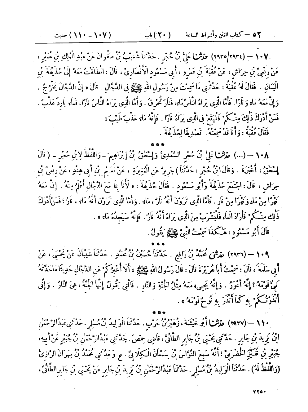 ١٠٧ - (٢٩٣٥ حَدَّثَنَا عَلِيُّ بْنُ حُجْرٍ، حَدَّثَنَا شُعَيْبُ بْنُ صَفْوَانَ، عَنْ عَبْدِ الْمَلِكِ بْنِ عُمَيْرٍ، عَنْ رِبْعِيِّ بْنِ حِرَاشٍ، عَنْ عُقْبَةَ بْنِ عَمْرٍو أَبِي مَسْعُودٍ الْأَنْصَارِيِّ، قَالَ: انْطَلَقْتُ مَعَهُ إِلَى حُذَيْفَةَ بْنِ الْيَمَانِ، فَقَالَ لَهُ عُقْبَةُ: حَدِّثْنِي مَا سَمِعْتَ مِنْ رَسُولِ اللهِ صَلَّى اللهُ عَلَيْهِ وَسَلَّمَ، فِي الدَّجَّالِ قَالَ: «إِنَّ الدَّجَّالَ يَخْرُجُ، وَإِنَّ مَعَهُ مَاءً وَنَارًا، فَأَمَّا الَّذِي يَرَاهُ النَّاسُ مَاءً، فَنَارٌ تُحْرِقُ، وَأَمَّا الَّذِي يَرَاهُ النَّاسُ نَارًا، فَمَاءٌ بَارِدٌ عَذْبٌ، فَمَنْ أَدْرَكَ ذَلِكَ مِنْكُمْ، فَلْيَقَعْ فِي الَّذِي يَرَاهُ نَارًا، فَإِنَّهُ مَاءٌ عَذْبٌ طَيِّبٌ»، فَقَالَ عُقْبَةُ: وَأَنَا قَدْ سَمِعْتُهُ تَصْدِيقًا لِحُذَيْفَةَ