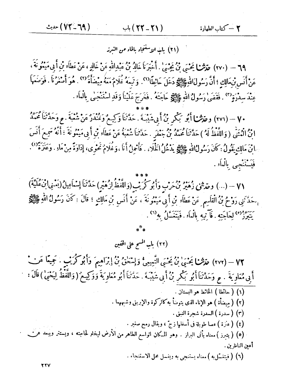 ٦٩ - (٢٧٠) حَدَّثَنَا يَحْيَى بْنُ يَحْيَى، أَخْبَرَنَا خَالِدُ بْنُ عَبْدِ اللهِ، عَنْ خَالِدٍ، عَنْ عَطَاءِ بْنِ أَبِي مَيْمُونَةَ، عَنْ أَنَسِ بْنِ مَالِكٍ أَنَّ رَسُولَ اللهِ صَلَّى اللهُ عَلَيْهِ وَسَلَّمَ: «دَخَلَ حَائِطًا وَتَبِعَهُ غُلَامٌ مَعَهُ مِيضَأَةٌ، هُوَ أَصْغَرُنَا، فَوَضَعَهَا عِنْدَ سِدْرَةٍ، فَقَضَى رَسُولُ اللهِ صلَّى اللهِ عليْهِ وسلَّمَ حَاجَتَهُ، فَخَرَجَ عَلَيْنَا وَقَدِ اسْتَنْجَى بِالْمَاءِ»
