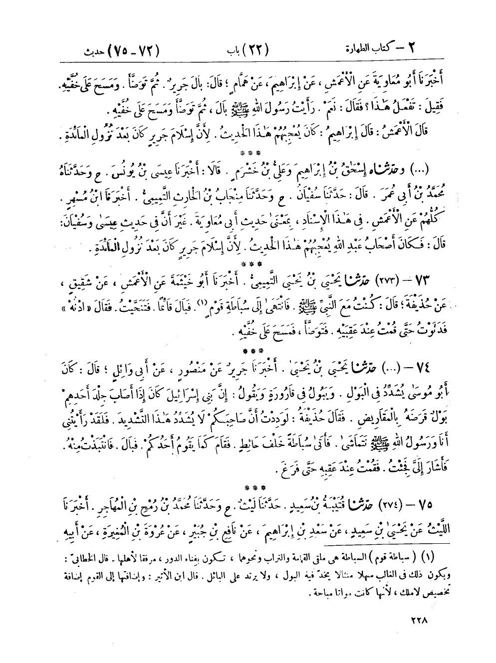 ٧٣ - (٢٧٣) حَدَّثَنَا يَحْيَى بْنُ يَحْيَى التَّمِيمِيُّ، أَخْبَرَنَا أَبُو خَيْثَمَةَ، عَنِ الْأَعْمَشِ، عَنْ شَقِيقٍ، عَنْ حُذَيْفَةَ، قَالَ: «كُنْتُ مَعَ النَّبِيِّ صَلَّى اللهُ عَلَيْهِ وَسَلَّمَ فَانْتَهَى إِلَى سُبَاطَةِ قَوْمٍ، فَبَالَ قَائِمًا» فَتَنَحَّيْتُ فَقَالَ: «ادْنُهْ» فَدَنَوْتُ حَتَّى قُمْتُ عِنْدَ عَقِبَيْهِ «فَتَوَضَّأَ فَمَسَحَ عَلَى خُفَّيْهِ»