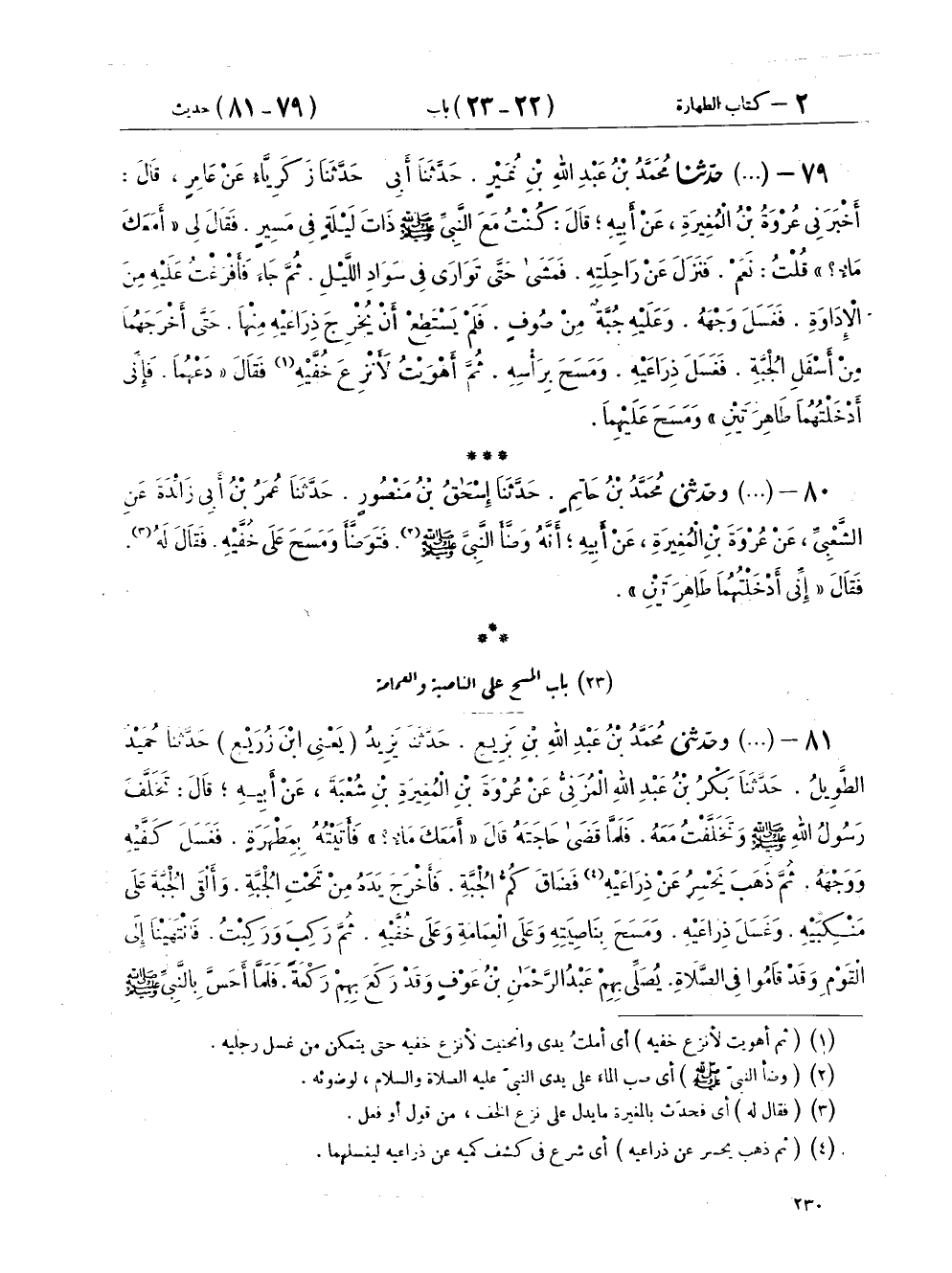 ٧٩ - (٢٧٤) حَدَّثَنَا مُحَمَّدُ بْنُ عَبْدِ اللهِ بْنِ نُمَيْرٍ، حَدَّثَنَا أَبِي، حَدَّثَنَا زَكَرِيَّا، عَنْ عَامِرٍ، قَالَ: أَخْبَرَنِي عُرْوَةُ بْنُ الْمُغِيرَةِ، عَنْ أَبِيهِ، قَالَ: كُنْتُ مَعَ النَّبِيِّ صَلَّى اللهُ عَلَيْهِ وَسَلَّمَ ذَاتَ لَيْلَةٍ فِي مَسِيرٍ، فَقَالَ لِي: «أَمَعَكَ مَاءٌ» قُلْتُ: نَعَمْ «فَنَزَلَ عَنْ رَاحِلَتِهِ، فَمَشَى حَتَّى تَوَارَى فِي سَوَادِ اللَّيْلِ، ثُمَّ جَاءَ فَأَفْرَغْتُ عَلَيْهِ مِنَ الْإِدَاوَةِ، فَغَسَلَ وَجْهَهُ، وَعَلَيْهِ جُبَّةٌ مِنْ صُوفٍ، فَلَمْ يَسْتَطِعْ أَنْ يُخْرِجَ ذِرَاعَيْهِ مِنْهَا حَتَّى أَخْرَجَهُمَا مِنْ أَسْفَلِ الْجُبَّةِ فَغَسَلَ ذِرَاعَيْهِ وَمَسَحَ بِرَأْسِهِ ثُمَّ أَهْوَيْتُ لِأَنْزِعَ خُفَّيْهِ» فَقَالَ: «دَعْهُمَا فَإِنِّي أَدْخَلْتُهُمَا طَاهِرَتَيْنِ وَمَسَحَ عَلَيْهِمَا»