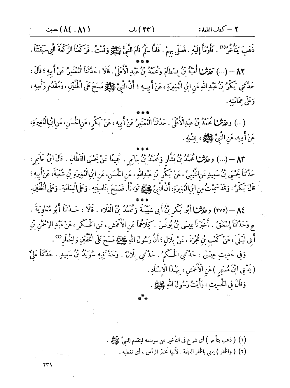 ٨٣ - (٢٤٧) وَحَدَّثَنَا مُحَمَّدُ بْنُ بَشَّارٍ، وَمُحَمَّدُ بْنُ حَاتِمٍ، جَمِيعًا عَنْ يَحْيَى الْقَطَّانِ، قَالَ: ابْنُ حَاتِمٍ، حَدَّثَنَا يَحْيَى بْنُ سَعِيدٍ، عَنِ التَّيْمِيِّ، عَنْ بَكْرِ بْنِ عَبْدِ اللهِ، عَنِ الْحَسَنِ، عَنِ ابْنِ الْمُغِيرَةِ بْنِ شُعْبَةَ، عَنْ أَبِيهِ، قَالَ: بَكْرٌ، وَقَدْ سَمِعْتَ مِنَ ابْنِ الْمُغِيرَةِ، أَنَّ النَّبِيَّ صَلَّى اللهُ عَلَيْهِ وَسَلَّمَ: «تَوَضَّأَ فَمَسَحَ بِنَاصِيَتِهِ، وَعَلَى الْعِمَامَةِ وَعَلَى الْخُفَّيْنِ»