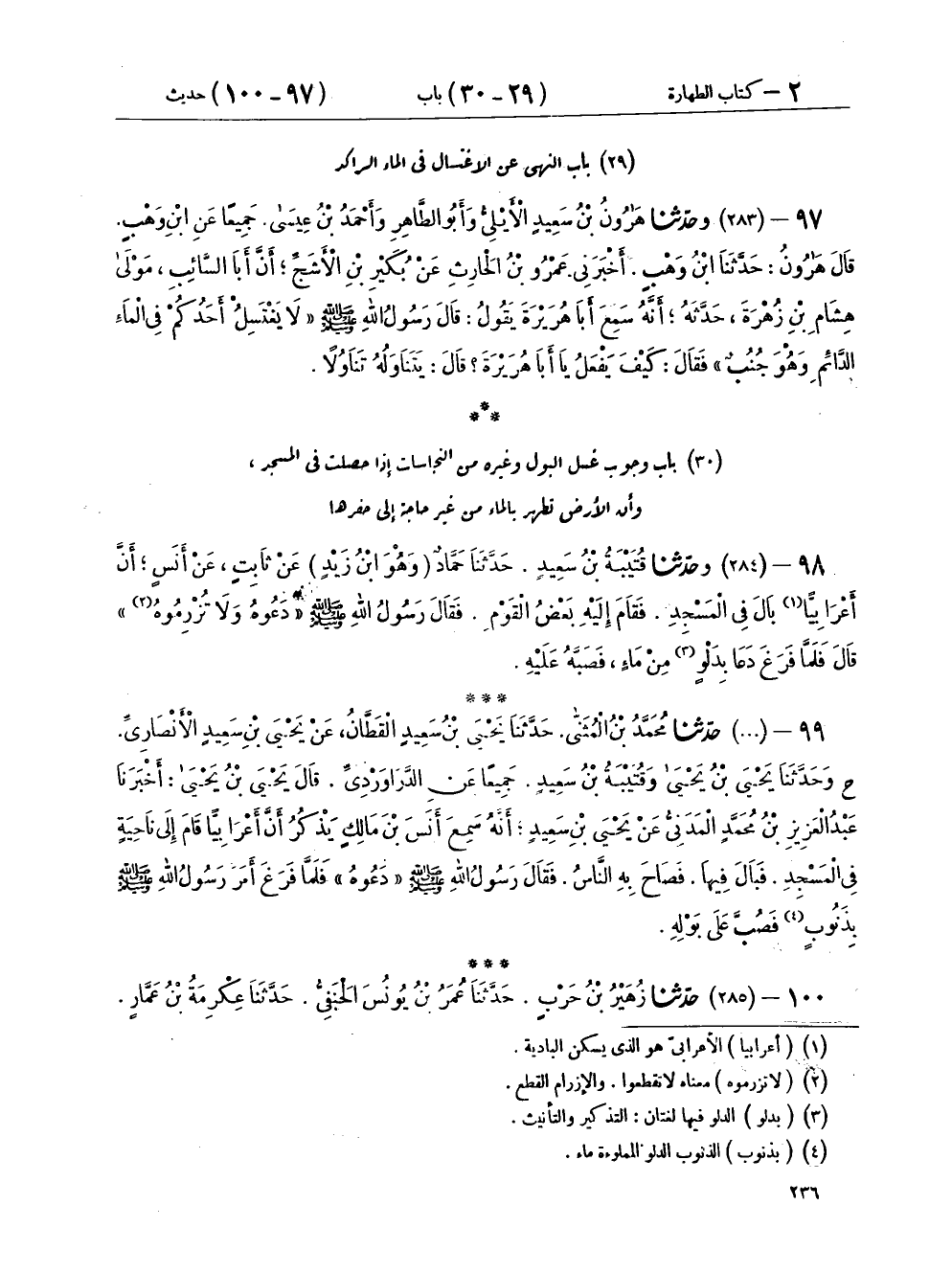 ٩٩ - (٢٨٤) حَدَّثَنَا مُحَمَّدُ بْنُ الْمُثَنَّى، حَدَّثَنَا يَحْيَى بْنُ سَعِيدٍ الْقَطَّانُ، عَنْ يَحْيَى بْنِ سَعِيدٍ الْأَنْصَارِيِّ، ح، وَحَدَّثَنَا يَحْيَى بْنُ يَحْيَى، وَقُتَيْبَةُ بْنُ سَعِيدٍ، جَمِيعًا عَنِ الدَّرَاوَرْدِيِّ، قَالَ يَحْيَى بْنُ يَحْيَى: أَخْبَرَنَا عَبْدُ الْعَزِيزِ بْنُ مُحَمَّدٍ الْمَدَنِيُّ، عَنْ يَحْيَى بْنِ سَعِيدٍ، أَنَّهُ سَمِعَ أَنَسَ بْنَ مَالِكٍ، يَذْكُرُ أَنَّ أَعْرَابِيًّا قَامَ إِلَى نَاحِيَةٍ فِي الْمَسْجِدِ فَبَالَ فِيهَا، فَصَاحَ بِهِ النَّاسُ، فَقَالَ رَسُولُ اللهِ صَلَّى اللهُ عَلَيْهِ وَسَلَّمَ: «دَعُوهُ» فَلَمَّا فَرَغَ أَمَرَ رَسُولُ اللهِ صَلَّى اللهُ عَلَيْهِ وَسَلَّمَ بِذَنُوبٍ فَصُبَّ عَلَى بَوْلِهِ
