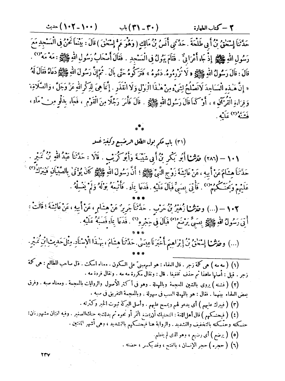 ١٠١ - (٢٨٦) حَدَّثَنَا أَبُو بَكْرِ بْنُ أَبِي شَيْبَةَ، وَأَبُو كُرَيْبٍ، قَالَا: حَدَّثَنَا عَبْدُ اللهِ بْنُ نُمَيْرٍ، حَدَّثَنَا هِشَامٌ، عَنْ أَبِيهِ، عَنْ عَائِشَةَ زَوْجِ النَّبِيِّ صَلَّى اللهُ عَلَيْهِ وَسَلَّمَ: «أَنَّ رَسُولَ اللهِ صَلَّى اللهُ عَلَيْهِ وَسَلَّمَ كَانَ يُؤْتَى بِالصِّبْيَانِ فَيُبَرِّكُ عَلَيْهِمْ وَيُحَنِّكُهُمْ، فَأُتِيَ بِصَبِيٍّ فَبَالَ عَلَيْهِ، فَدَعَا بِمَاءٍ، فَأَتْبَعَهُ بَوْلَهُ وَلَمْ يَغْسِلْهُ»