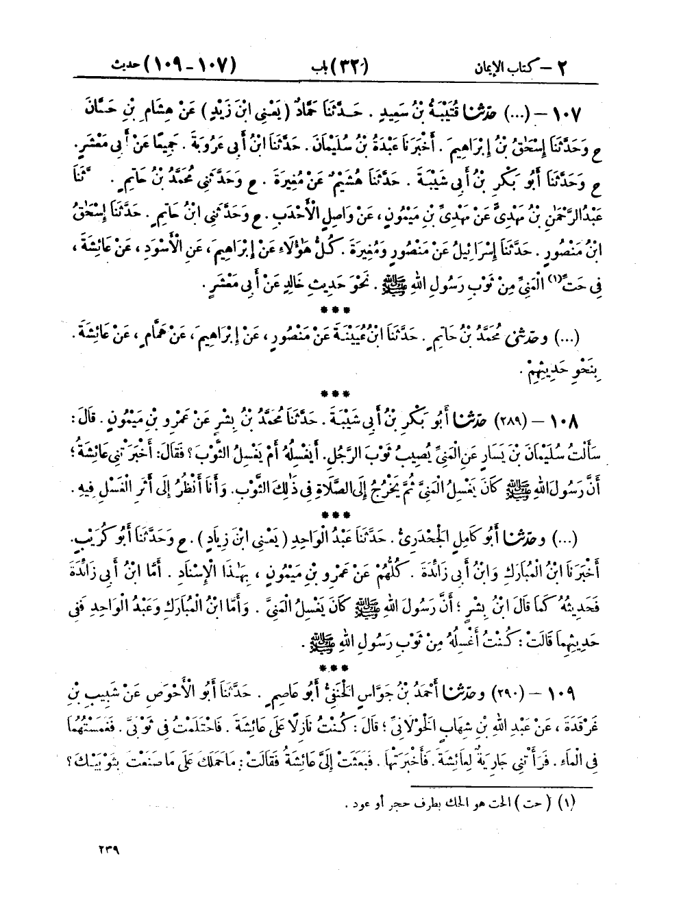 ١٠٧ - (٢٨٨) حَدَّثَنَا قُتَيْبَةُ بْنُ سَعِيدٍ، حَدَّثَنَا حَمَّادٌ يَعْنِي ابْنَ زَيْدٍ، عَنْ هِشَامِ بْنِ حَسَّانَ ح، وَحَدَّثَنَا إِسْحَاقُ بْنُ إِبْرَاهِيمَ، أَخْبَرَنَا عَبْدَةُ بْنُ سُلَيْمَانَ، حَدَّثَنَا ابْنُ أَبِي عَرُوبَةَ جَمِيعًا عَنْ أَبِي مَعْشَرٍ ح، وَحَدَّثَنَا أَبُو بَكْرِ بْنُ أَبِي شَيْبَةَ، حَدَّثَنَا هُشَيْمٌ، عَنْ مُغِيرَةَ، ح، وَحَدَّثَنِي مُحَمَّدُ بْنُ حَاتِمٍ، حَدَّثَنَا عَبْدُ الرَّحْمَنِ بْنُ مَهْدِيٍّ، عَنْ مَهْدِيِّ بْنِ مَيْمُونٍ، عَنْ وَاصِلٍ الْأَحْدَبِ، ح، وَحَدَّثَنِي ابْنُ حَاتِمٍ، حَدَّثَنَا إِسْحَاقُ بْنُ مَنْصُورٍ، حَدَّثَنَا إِسْرَائِيلُ، عَنْ مَنْصُورٍ، وَمُغِيرَةَ، كُلُّ هَؤُلَاءِ عَنْ إِبْرَاهِيمَ، عَنِ الْأَسْوَدِ، عَنْ عَائِشَةَ فِي حَتِّ الْمَنِيِّ مِنْ ثَوْبِ رَسُولِ اللهِ صَلَّى اللهُ عَلَيْهِ وَسَلَّمَ نَحْوَ حَدِيثِ خَالِدٍ، عَنْ أَبِي مَعْشَرٍ
