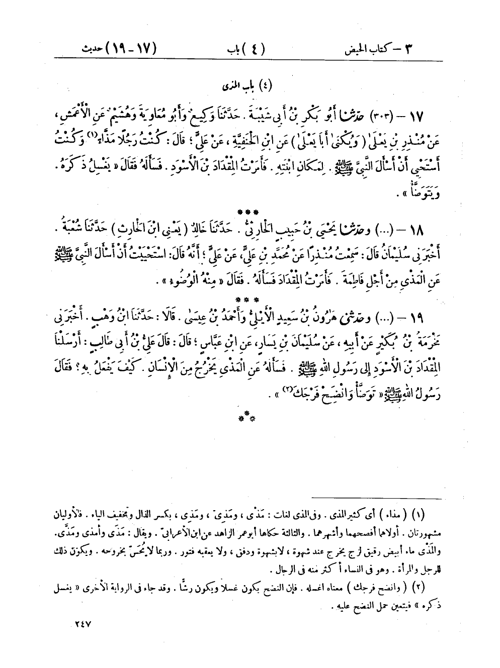 ١٧ - (٣٠٣) حَدَّثَنَا أَبُو بَكْرِ بْنُ أَبِي شَيْبَةَ، حَدَّثَنَا وَكِيعٌ، وَأَبُو مُعَاوِيَةَ، وَهُشَيْمٌ، عَنِ الْأَعْمَشِ، عَنْ مُنْذِرِ بْنِ يَعْلَى، - وَيُكْنَى أَبَا يَعْلَى - عَنِ ابْنِ الْحَنَفِيَّةِ، عَنْ عَلِيٍّ قَالَ: كُنْتُ رَجُلًا مَذَّاءً وَكُنْتُ أَسْتَحْيِي أَنْ أَسْأَلَ النَّبِيَّ صَلَّى اللهُ عَلَيْهِ وَسَلَّمَ لِمَكَانِ ابْنَتِهِ فَأَمَرْتُ الْمِقْدَادَ بْنَ الْأَسْوَدِ فَسَأَلَهُ فَقَالَ: «يَغْسِلُ ذَكَرَهُ وَيَتَوَضَّأُ»