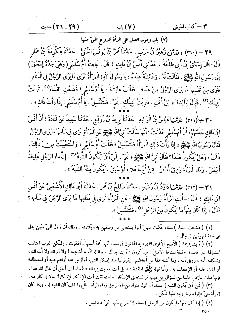 ٣١ - (٣١٢) حَدَّثَنَا دَاوُدُ بْنُ رُشَيْدٍ، حَدَّثَنَا صَالِحُ بْنُ عُمَرَ، حَدَّثَنَا أَبُو مَالِكٍ الْأَشْجَعِيُّ، عَنْ أَنَسِ بْنِ مَالِكٍ، قَالَ: سَأَلَتِ امْرَأَةٌ رَسُولَ اللهِ صَلَّى اللهُ عَلَيْهِ وَسَلَّمَ عَنِ الْمَرْأَةِ تَرَى فِي مَنَامِهَا مَا يَرَى الرَّجُلُ فِي مَنَامِهِ، فَقَالَ: «إِذَا كَانَ مِنْهَا مَا يَكُونُ مِنَ الرَّجُلِ فَلْتَغْتَسِلْ»