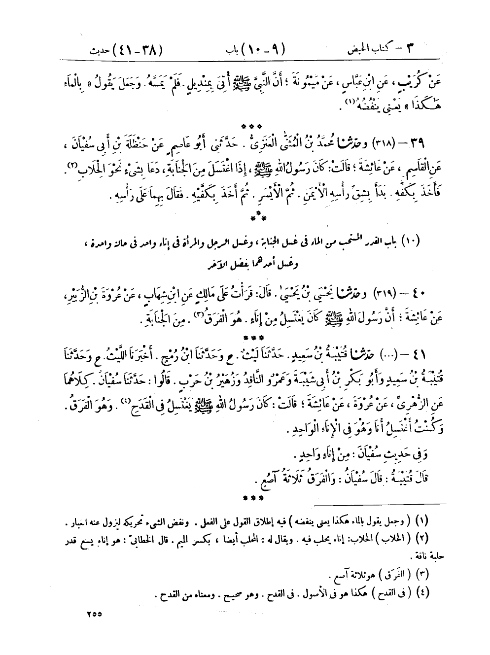 ٤١ - (٣١٩) حَدَّثَنَا قُتيْبَةُ بْنُ سَعِيدٍ، حَدَّثَنَا لَيْثٌ، ح، وَحَدَّثَنَا ابْنُ رُمْحٍ، أَخْبَرَنَا اللَّيْثُ، ح، وَحَدَّثَنَا قُتيْبةُ بْنُ سَعِيدٍ، وأَبُو بكْرِ بْنُ أَبِي شَيْبَةَ، وَعَمْرٌو النَّاقدُ، وَزُهَيْرُ بْنُ حَرْبٍ قَالُوا: حَدَّثَنَا سُفْيانُ كِلَاهُمَا عَنِ الزُّهْرِيِّ، عَنْ عُرْوةَ، عَنْ عَائِشَةَ، قَالَتْ: «كَانَ رَسُولُ اللهِ صَلَّى اللهُ عَلَيْهِ وَسَلَّمَ يَغْتَسِلُ فِي الْقَدَحِ وَهُوَ الْفَرَقُ، وَكُنْتُ أَغْتَسِلُ أَنَا وَهُوَ فِي الْإِنَاءِ الْوَاحِدِ» وَفِي حَدِيثِ سُفْيانَ مِنْ إِنَاءٍ وَاحِدٍ، قَالَ قُتيْبةُ: قَالَ سُفْيانُ: «وَالْفَرَقُ ثَلَاثَةُ آصُعٍ»