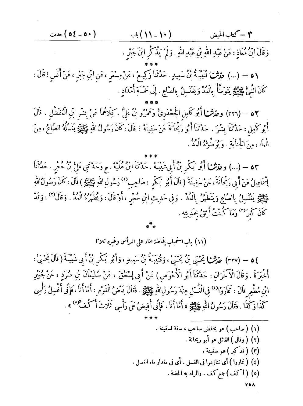 ٥٤ - (٣٢٧) حَدَّثَنَا يَحْيَى بْنُ يَحْيَى، وَقُتَيْبَةُ بْنُ سَعِيدٍ، وَأَبُو بَكْرِ بْنُ أَبِي شَيْبَةَ، - قَالَ: يَحْيَى أَخْبَرَنَا وَقَالَ الْآخَرَانِ - حَدَّثَنَا أَبُو الْأَحْوَصِ، عَنْ أَبِي إِسْحَاقَ، عَنْ سُلَيْمَانَ بْنِ صُرَدٍ، عَنْ جُبَيْرِ بْنِ مُطْعِمٍ، قَالَ: تَمَارَوْا فِي الْغُسْلِ عِنْدَ رَسُولِ اللهِ صَلَّى اللهُ عَلَيْهِ وَسَلَّمَ. فَقَالَ بَعْضُ الْقَوْمِ: أَمَّا أَنَا فَإِنِّي أَغْسِلُ رَأْسِي كَذَا وَكَذَا. فَقَالَ رَسُولُ اللهِ صَلَّى اللهُ عَلَيْهِ وَسَلَّمَ: «أَمَّا أَنَا فَإِنِّي أُفِيضُ عَلَى رَأْسِي ثَلَاثَ أَكُفٍّ»
