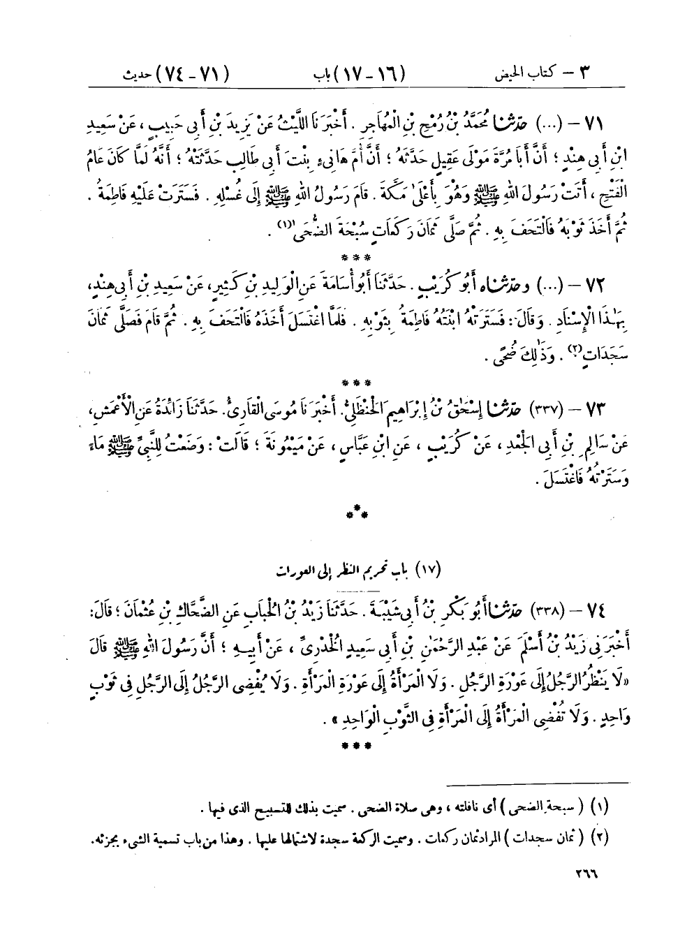 ٧٤ - (٣٣٨) حَدَّثَنَا أَبُو بَكْرِ بْنُ أَبِي شَيْبَةَ، حَدَّثَنَا زَيْدُ بْنُ الْحُبَابِ، عَنِ الضَّحَّاكِ بْنِ عُثْمَانَ، قَالَ: أَخْبَرَنِي زَيْدُ بْنُ أَسْلَمَ، عَنْ عَبْدِ الرَّحْمَنِ بْنِ أَبِي سَعِيدٍ الْخُدْرِيِّ، عَنْ أَبِيهِ، أَنَّ رَسُولَ اللهِ صَلَّى اللهُ عَلَيْهِ وَسَلَّمَ قَالَ: «لَا يَنْظُرُ الرَّجُلُ إِلَى عَوْرَةِ الرَّجُلِ، وَلَا الْمَرْأَةُ إِلَى عَوْرَةِ الْمَرْأَةِ، وَلَا يُفْضِي الرَّجُلُ إِلَى الرَّجُلِ فِي ثَوْبٍ وَاحِدٍ، وَلَا تُفْضِي الْمَرْأَةُ إِلَى الْمَرْأَةِ فِي الثَّوْبِ الْوَاحِدِ»