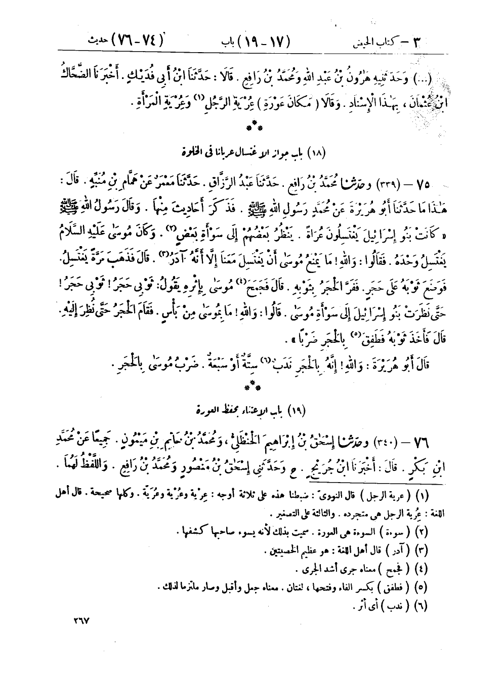 ٧٥ - (٣٣٩) وَحَدَّثَنَا مُحَمَّدُ بْنُ رَافِعٍ، حَدَّثَنَا عَبْدُ الرَّزَّاقِ، حَدَّثَنَا مَعْمَرٌ، عَنْ هَمَّامِ بْنِ مُنَبِّهٍ، قَالَ: هَذَا مَا حَدَّثَنَا أَبُو هُرَيْرَةَ، عَنْ مُحَمَّدٍ رَسُولِ اللهِ صَلَّى اللهُ عَلَيْهِ وَسَلَّمَ. فَذَكَرَ أَحَادِيثَ مِنْهَا. وَقَالَ رَسُولُ اللهِ صَلَّى اللهُ عَلَيْهِ وَسَلَّمَ: " كَانَتْ بَنُو إِسْرَائِيلَ يَغْتَسِلُونَ عُرَاةً، يَنْظُرُ بَعْضُهُمْ إِلَى سَوْأَةِ بَعْضٍ. وَكَانَ مُوسَى عَلَيْهِ السَّلَامُ يَغْتَسِلُ وَحْدَهُ، فَقَالُوا: وَاللهِ مَا يَمْنَعُ مُوسَى أَنْ يَغْتَسِلَ مَعَنَا إِلَّا أَنَّهُ آدَرُ قَالَ: فَذَهَبَ مَرَّةً يَغْتَسِلُ فَوَضَعَ ثَوْبَهُ عَلَى حَجَرٍ، فَفَرَّ الْحَجَرُ بِثَوْبِهِ. قَالَ: فَجَمَحَ مُوسَى بِإِثْرِهِ يَقُولُ: ثَوْبِي حَجَرُ، ثَوْبِي حَجَرُ، حَتَّى نَظَرَتْ بَنُو إِسْرَائِيلَ إِلَى سَوْأَةِ مُوسَى قَالُوا: وَاللهِ، مَا بِمُوسَى مِنْ بَأْسٍ، فَقَامَ الْحَجَرُ حَتَّى نُظِرَ إِلَيْهِ، قَالَ: فَأَخَذَ ثَوْبَهُ فَطَفِقَ بِالْحَجَرِ ضَرْبًا " قَالَ أَبُو هُرَيْرَةَ: «وَاللهِ إِنَّهُ بِالْحَجَرِ نَدَبٌ سِتَّةٌ، أَوْ سَبْعَةٌ، ضَرْبُ مُوسَى بِالْحَجَرِ»