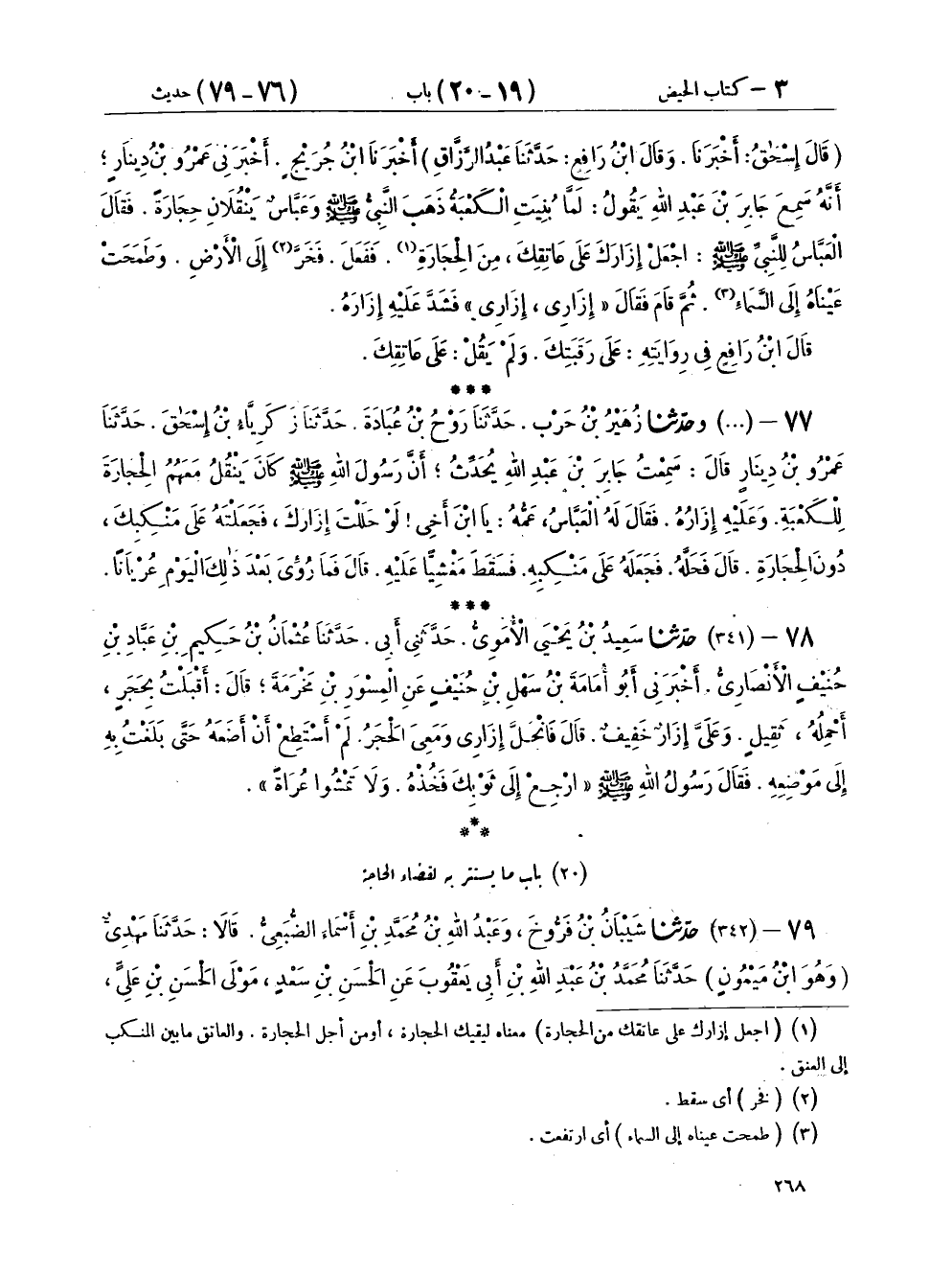 ٧٧ - (٣٤٠) وَحَدَّثَنَا زُهَيْرُ بْنُ حَرْبٍ، حَدَّثَنَا رَوْحُ بْنُ عُبَادَةَ، حَدَّثَنَا زَكَرِيَّا بْنُ إِسْحَاقَ، حَدَّثَنَا عَمْرُو بْنُ دِينَارٍ، قَالَ: سَمِعْتُ جَابِرَ بْنَ عَبْدِ اللهِ، يُحَدِّثُ أَنَّ رَسُولَ اللهِ صَلَّى اللهُ عَلَيْهِ وَسَلَّمَ كَانَ يَنْقُلُ مَعَهُمُ الْحِجَارَةَ لِلْكَعْبَةِ وَعَلَيْهِ إِزَارُهُ. فَقَالَ لَهُ الْعَبَّاسُ عَمُّهُ يَا ابْنَ أَخِي لَوْ حَلَلْتَ إِزَارَكَ فَجَعَلْتَهُ عَلَى مَنْكِبِكَ دُونَ الْحِجَارَةِ. قَالَ: «فَحَلَّهُ. فَجَعَلَهُ عَلَى مَنْكِبِهِ فَسَقَطَ مَغْشِيًّا عَلَيْهِ»، قَالَ: «فَمَا رُئِيَ بَعْدَ ذَلِكَ الْيَوْمِ عُرْيَانًا»