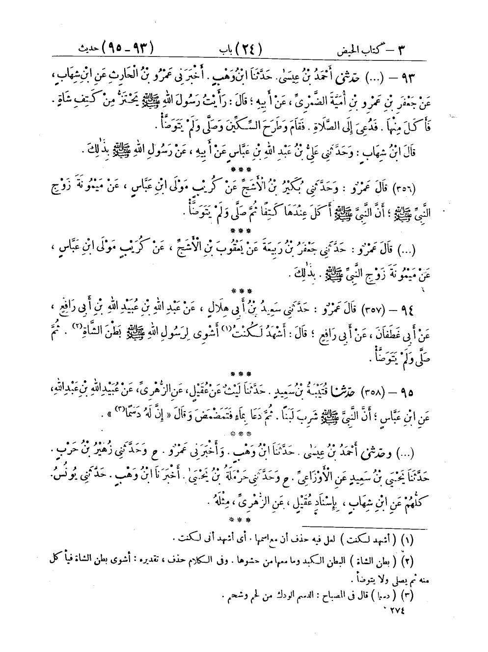 ٩٣ - (٣٥٥) حَدَّثَنِي أَحْمَدُ بْنُ عِيسَى، حَدَّثَنَا ابْنُ وَهْبٍ، أَخْبَرَنِي عَمْرُو بْنُ الْحَارِثِ، عَنِ ابْنِ شِهَابٍ، عَنْ جَعْفَرِ بْنِ عَمْرِو بْنِ أُمَيَّةَ الضَّمْرِيِّ، عَنْ أَبِيهِ، قَالَ: «رَأَيْتُ رَسُولَ اللهِ صَلَّى اللهُ عَلَيْهِ وَسَلَّمَ يَحْتَزُّ مِنْ كَتِفِ شَاةٍ، فَأَكَلَ مِنْهَا، فَدُعِيَ إِلَى الصَّلَاةِ، فَقَامَ وَطَرَحَ السِّكِّينَ، وَصَلَّى وَلَمْ يَتَوَضَّأْ» قَالَ ابْنُ شِهَابٍ: وَحَدَّثَنِي عَلِيُّ بْنُ عَبْدِ اللهِ بْنِ عَبَّاسٍ، عَنْ أَبِيهِ عَنْ رَسُولِ اللهِ صَلَّى اللهُ عَلَيْهِ وَسَلَّمَ