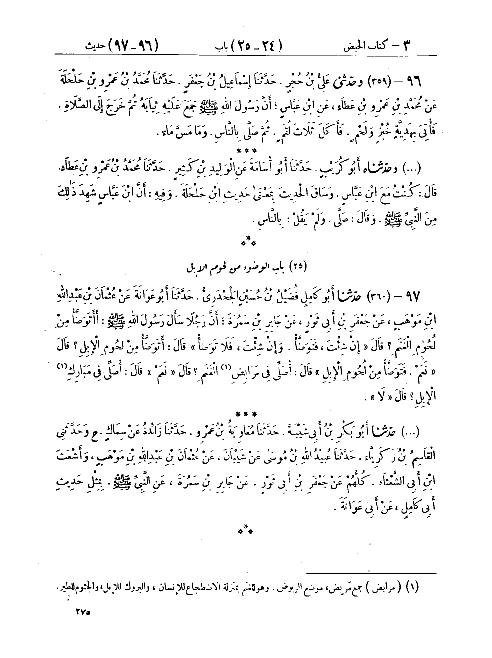 ٩٧ - (٣٦٠) حَدَّثَنَا أَبُو كَامِلٍ فُضَيْلُ بْنُ حُسَيْنٍ الْجَحْدَرِيُّ، حَدَّثَنَا أَبُو عَوَانَةَ، عَنْ عُثْمَانَ بْنِ عَبْدِ اللهِ بْنِ مَوْهَبٍ، عَنْ جَعْفَرِ بْنِ أَبِي ثَوْرٍ، عَنْ جَابِرِ بْنِ سَمُرَةَ، أَنَّ رَجُلًا سَأَلَ رَسُولَ اللهِ صَلَّى اللهُ عَلَيْهِ وَسَلَّمَ أَأَتَوَضَّأُ مِنْ لُحُومِ الْغَنَمِ؟ قَالَ: «إِنْ شِئْتَ فَتَوَضَّأْ، وَإِنْ شِئْتَ فَلَا تَوَضَّأْ» قَالَ أَتَوَضَّأُ مِنْ لُحُومِ الْإِبِلِ؟ قَالَ: «نَعَمْ فَتَوَضَّأْ مِنْ لُحُومِ الْإِبِلِ» قَالَ: أُصَلِّي فِي مَرَابِضِ الْغَنَمِ؟ قَالَ: «نَعَمْ» قَالَ: أُصَلِّي فِي مَبَارِكِ الْإِبِلِ؟ قَالَ: «لَا»