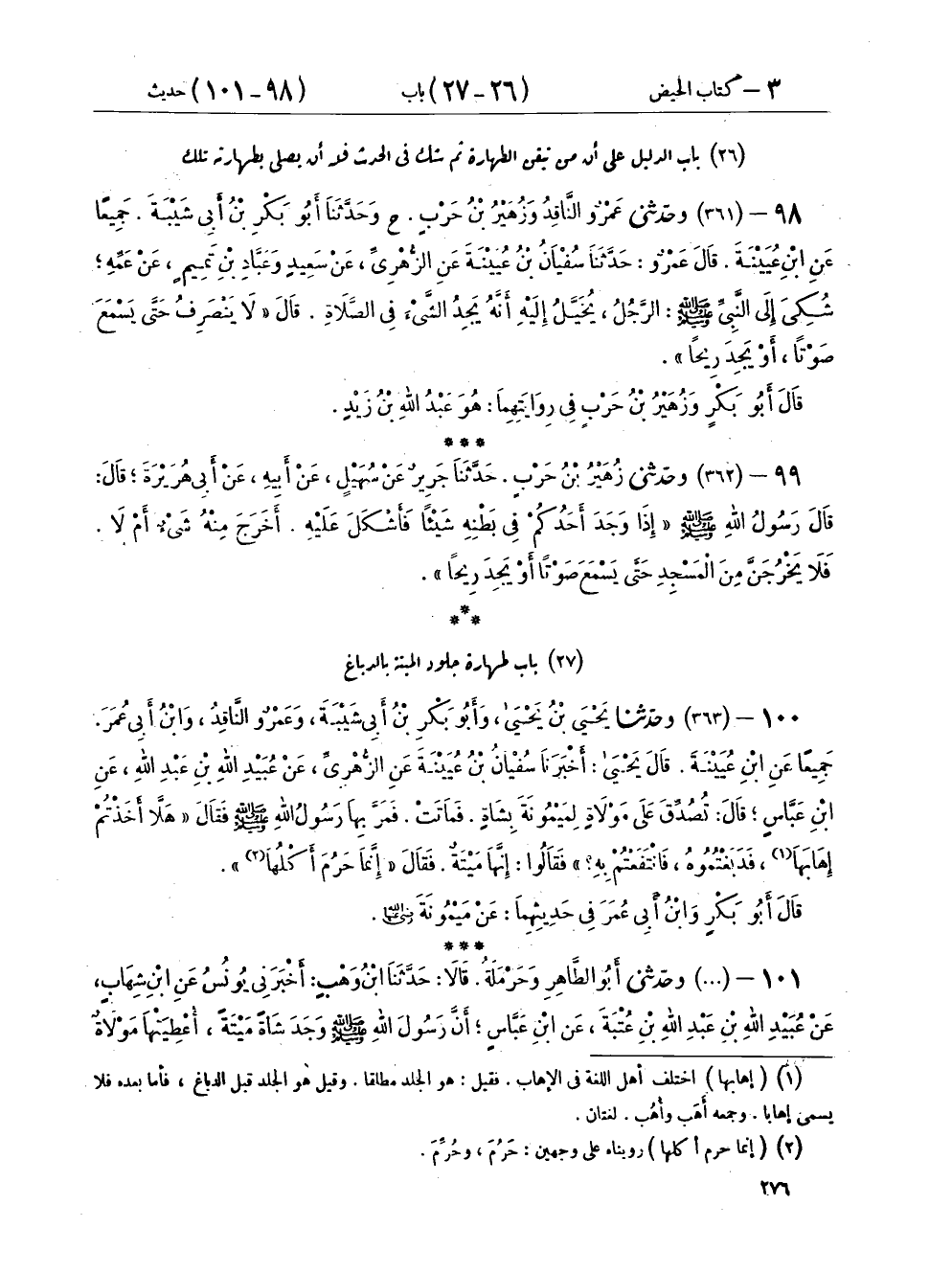 ١٠٠ - (٣٦٣) وَحَدَّثَنَا يَحْيَى بْنُ يَحْيَى، وَأَبُو بَكْرِ بْنُ أَبِي شَيْبَةَ، وَعَمْرٌو النَّاقِدُ، وَابْنُ أَبِي عُمَرَ، جَمِيعًا عَنِ ابْنِ عُيَيْنَةَ، قَالَ يَحْيَى: أَخْبَرَنَا سُفْيَانُ بْنُ عُيَيْنَةَ، عَنِ الزُّهْرِيِّ، عَنْ عُبَيْدِ اللهِ بْنِ عَبْدِ اللهِ، عَنِ ابْنِ عَبَّاسٍ، قَالَ: تُصُدِّقَ عَلَى مَوْلَاةٍ لِمَيْمُونَةَ بِشَاةٍ فَمَاتَتْ فَمَرَّ بِهَا رَسُولُ اللهِ صَلَّى اللهُ عَلَيْهِ وَسَلَّمَ فَقَالَ: «هَلَّا أَخَذْتُمْ إِهَابَهَا فَدَبَغْتُمُوهُ فَانْتَفَعْتُمْ بِهِ؟» فَقَالُوا: إِنَّهَا مَيْتَةٌ فَقَالَ: «إِنَّمَا حَرُمَ أَكْلُهَا» قَالَ أَبُو بَكْرٍ، وَابْنُ أَبِي عُمَرَ، فِي حَدِيثِهِمَا عَنْ مَيْمُونَةَ رَضِيَ اللهُ عَنْهَا