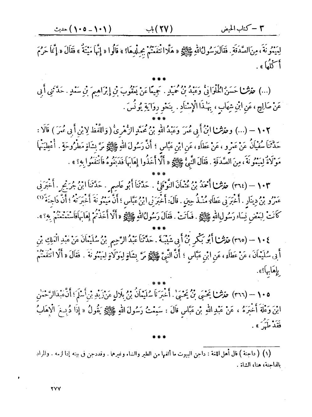 ١٠٢ - (٣٦٣) وَحَدَّثَنَا ابْنُ أَبِي عُمَرَ، وَعَبْدُ اللهِ بْنُ مُحَمَّدٍ الزُّهْرِيُّ، - وَاللَّفْظُ لِابْنِ أَبِي عُمَرَ -، قَالَا: حَدَّثَنَا سُفْيَانُ، عَنْ عَمْرٍو، عَنْ عَطَاءٍ، عَنِ ابْنِ عَبَّاسٍ، أَنَّ رَسُولَ اللهِ صَلَّى اللهُ عَلَيْهِ وَسَلَّمَ مَرَّ بِشَاةٍ مَطْرُوحَةٍ أُعْطِيَتْهَا مَوْلَاةٌ لِمَيْمُونَةَ مِنَ الصَّدَقَةِ، فَقَالَ النَّبِيُّ صَلَّى اللهُ عَلَيْهِ وَسَلَّمَ: «أَلَّا أَخَذُوا إِهَابَهَا فَدَبَغُوهُ فَانْتَفَعُوا بِهِ؟»
