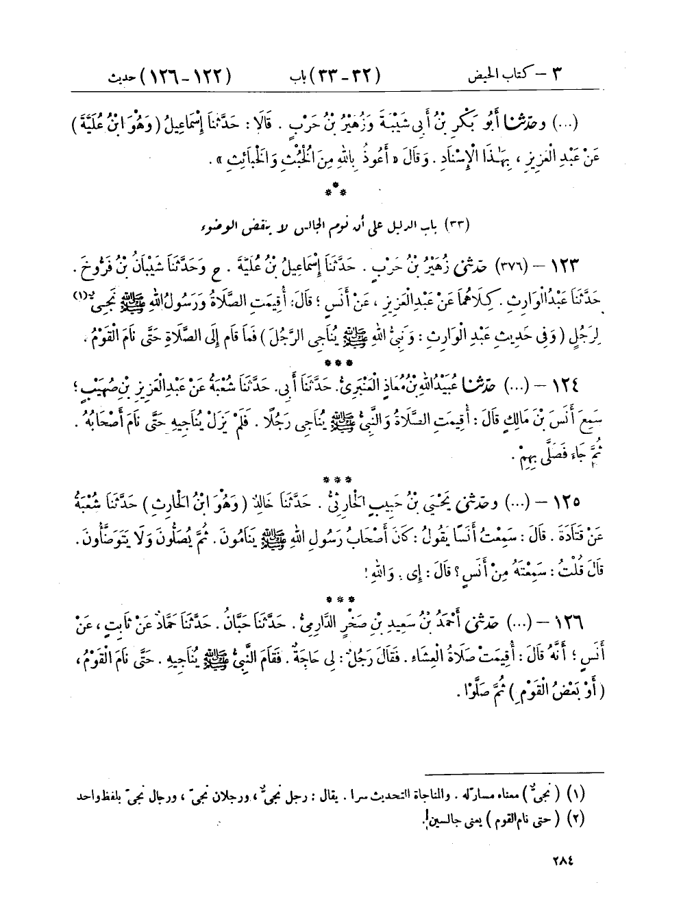 ١٢٣ - (٣٧٦) حَدَّثَنِي زُهَيْرُ بْنُ حَرْبٍ، حَدَّثَنَا إِسْمَاعِيلُ ابْنُ عُلَيَّةَ ح، وَحَدَّثَنَا شَيْبَانُ بْنُ فَرُّوخَ، حَدَّثَنَا عَبْدُ الْوَارِثِ كِلَاهُمَا عَنْ عَبْدِ الْعَزِيزِ، عَنْ أَنَسٍ، قَالَ: " أُقِيمَتِ الصَّلَاةُ وَرَسُولُ اللهِ صَلَّى اللهُ عَلَيْهِ وَسَلَّمَ نَجِيٌّ لِرَجُلٍ - وَفِي حَدِيثِ عَبْدِ الْوَارِثِ: وَنَبِيُّ اللهِ صَلَّى اللهُ عَلَيْهِ وَسَلَّمَ يُنَاجِي الرَّجُلَ - فَمَا قَامَ إِلَى الصَّلَاةِ حَتَّى نَامَ الْقَوْمُ "