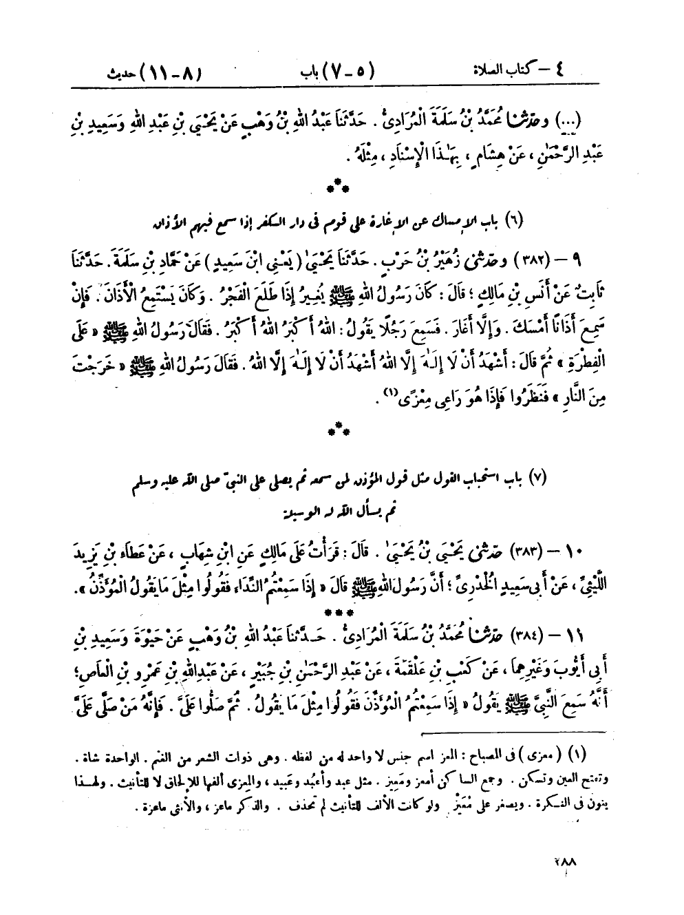 ١١ - (٣٨٤) حَدَّثَنَا مُحَمَّدُ بْنُ سَلَمَةَ الْمُرَادِيُّ، حَدَّثَنَا عَبْدُ اللهِ بْنُ وَهْبٍ، عَنْ حَيْوَةَ، وَسَعِيدِ بْنِ أَبِي أَيُّوبَ، وَغَيْرِهِمَا عَنْ كَعْبِ بْنِ عَلْقَمَةَ، عَنْ عَبْدِ الرَّحْمَنِ بْنِ جُبَيْرٍ، عَنْ عَبْدِ اللهِ بْنِ عَمْرِو بْنِ الْعَاصِ، أَنَّهُ سَمِعَ النَّبِيَّ صَلَّى اللهُ عَلَيْهِ وَسَلَّمَ يَقُولُ: «إِذَا سَمِعْتُمُ الْمُؤَذِّنَ، فَقُولُوا مِثْلَ مَا يَقُولُ ثُمَّ صَلُّوا عَلَيَّ، فَإِنَّهُ مَنْ صَلَّى عَلَيَّ صَلَاةً صَلَّى الله عَلَيْهِ بِهَا عَشْرًا، ثُمَّ سَلُوا اللهَ لِيَ الْوَسِيلَةَ، فَإِنَّهَا مَنْزِلَةٌ فِي الْجَنَّةِ، لَا تَنْبَغِي إِلَّا لِعَبْدٍ مِنْ عِبَادِ اللهِ، وَأَرْجُو أَنْ أَكُونَ أَنَا هُوَ، فَمَنْ سَأَلَ لِي الْوَسِيلَةَ حَلَّتْ لَهُ الشَّفَاعَةُ»