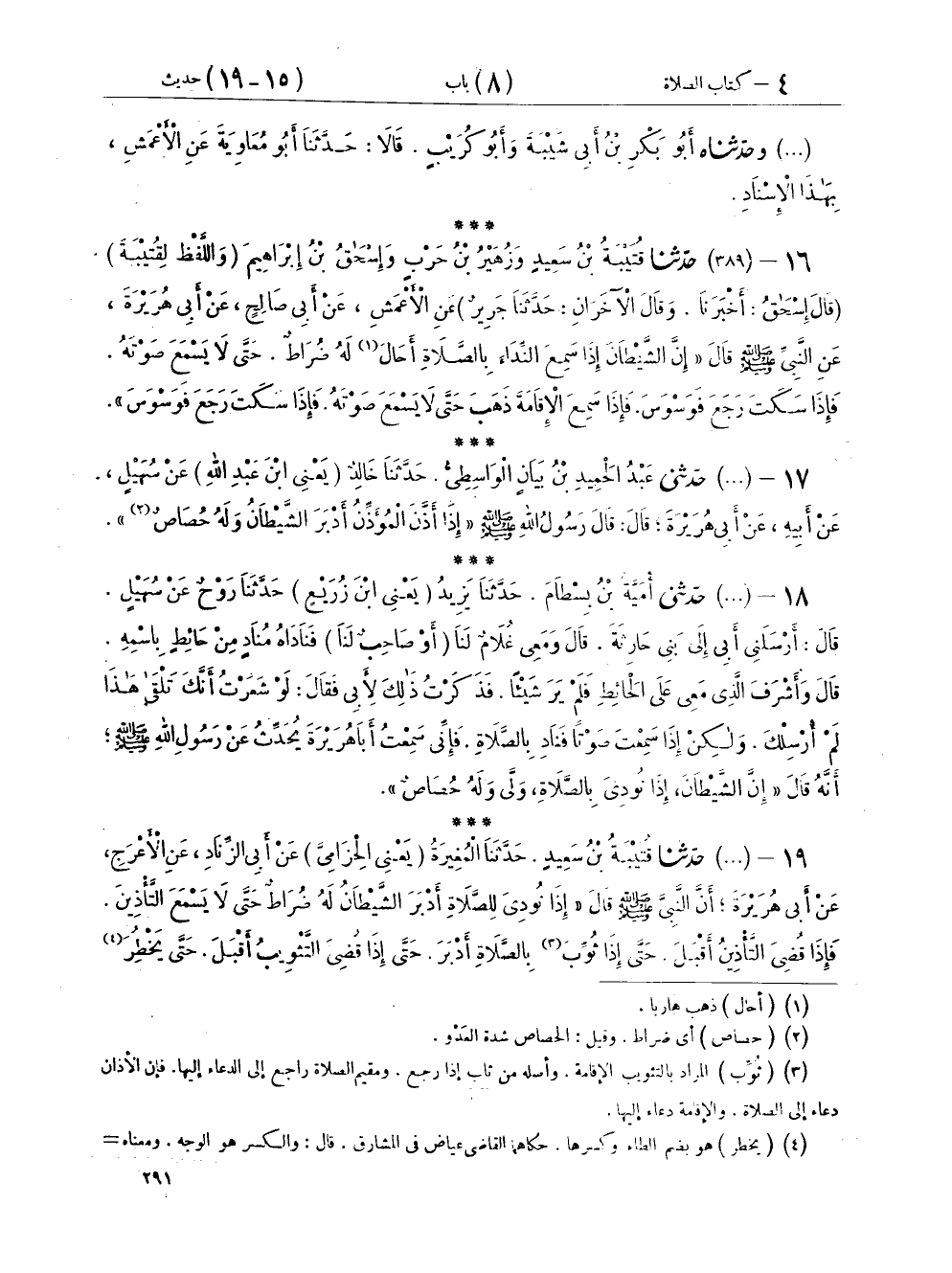 ١٦ - (٣٨٩) حَدَّثَنَا قُتَيْبَةُ بْنُ سَعِيدٍ، وَزُهَيْرُ بْنُ حَرْبٍ، وَإِسْحَاقُ بْنُ إِبْرَاهِيمَ، - وَاللَّفْظُ لِقُتَيْبَةَ، قَالَ إِسْحَاقُ، أَخْبَرَنَا، وَقَالَ الْآخَرَانِ - حَدَّثَنَا جَرِيرٌ، عَنِ الْأَعْمَشِ، عَنْ أَبِي صَالِحٍ، عَنْ أَبِي هُرَيْرَةَ، عَنِ النَّبِيِّ صَلَّى اللهُ عَلَيْهِ وَسَلَّمَ قَالَ: «إِنَّ الشَّيْطَانَ إِذَا سَمِعَ النِّدَاءَ بِالصَّلَاةِ أَحَالَ لَهُ ضُرَاطٌ حَتَّى لَا يَسْمَعَ صَوْتَهُ. فَإِذَا سَكَتَ رَجَعَ فَوَسْوَسَ فَإِذَا سَمِعَ الْإِقَامَةَ ذَهَبَ حَتَّى لَا يَسْمَعَ صَوْتَهُ فَإِذَا سَكَتَ رَجَعَ فَوَسْوَسَ»