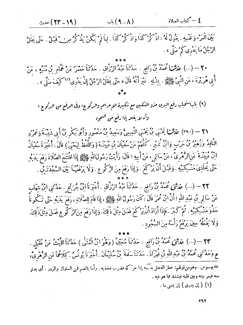 ٢٢ - (٣٩٠) حَدَّثَنِي مُحَمَّدُ بْنُ رَافِعٍ، حَدَّثَنَا عَبْدُ الرَّزَّاقِ، أَخْبَرَنَا ابْنُ جُرَيْجٍ، حَدَّثَنِي ابْنُ شِهَابٍ، عَنْ سَالِمِ بْنِ عَبْدِ اللهِ، أَنَّ ابْنَ عُمَرَ، قَالَ: «كَانَ رَسُولُ اللهِ صَلَّى اللهُ عَلَيْهِ وَسَلَّمَ إِذَا قَامَ لِلصَّلَاةِ رَفَعَ يَدَيْهِ حَتَّى تَكُونَا حَذْوَ مَنْكِبَيْهِ، ثُمَّ كَبَّرَ، فَإِذَا أَرَادَ أَنْ يَرْكَعَ فَعَلَ مِثْلَ ذَلِكَ، وَإِذَا رَفَعَ مِنَ الرُّكُوعِ فَعَلَ مِثْلَ ذَلِكَ، وَلَا يَفْعَلُهُ حِينَ يَرْفَعُ رَأْسَهُ مِنَ السُّجُودِ»