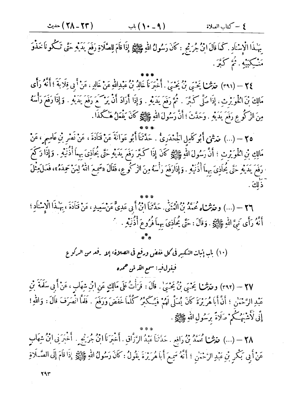 ٢٤ - (٣٩١) حَدَّثَنَا يَحْيَى بْنُ يَحْيَى، أَخْبَرَنَا خَالِدُ بْنُ عَبْدِ اللهِ، عَنْ خَالِدٍ، عَنْ أَبِي قِلَابَةَ، أَنَّهُ رَأَى مَالِكَ بْنَ الْحُوَيْرِثِ، «إِذَا صَلَّى كَبَّرَ، ثُمَّ رَفَعَ يَدَيْهِ، وَإِذَا أَرَادَ أَنْ يَرْكَعَ رَفَعَ يَدَيْهِ، وَإِذَا رَفَعَ رَأْسَهُ مِنَ الرُّكُوعِ رَفَعَ يَدَيْهِ»، وَحَدَّثَ «أَنَّ رَسُولَ اللهِ صَلَّى اللهُ عَلَيْهِ وَسَلَّمَ كَانَ يَفْعَلُ هَكَذَا»