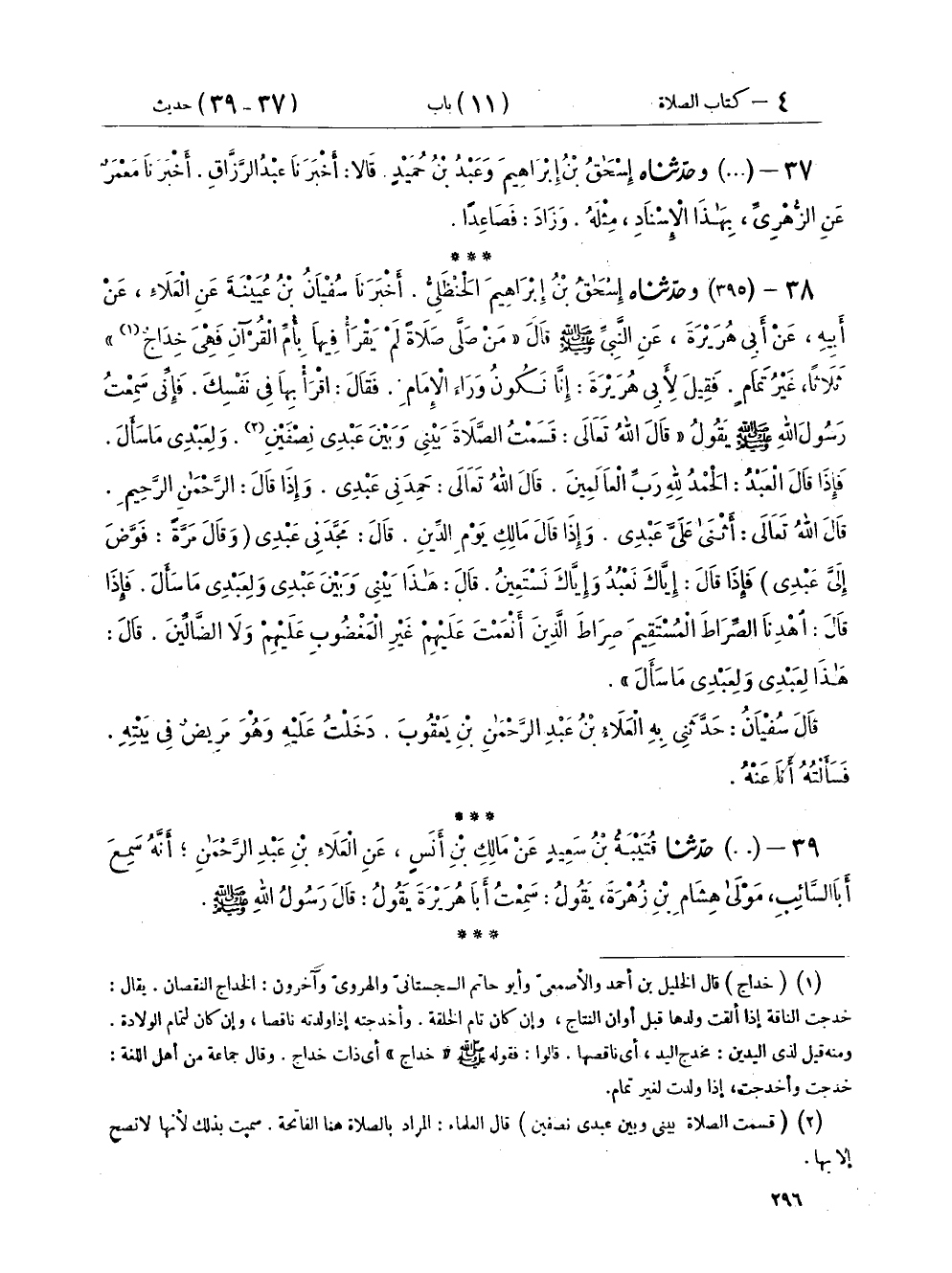 ٣٨ - (٣٩٥) وَحَدَّثَنَاهُ إِسْحَاقُ بْنُ إِبْرَاهِيمَ الْحَنْظَلِيُّ، أَخْبَرَنَا سُفْيَانُ بْنُ عُيَيْنَةَ، عَنِ الْعَلَاءِ، عَنْ أَبِيهِ، عَنْ أَبِي هُرَيْرَةَ، عَنِ النَّبِيِّ صَلَّى اللهُ عَلَيْهِ وَسَلَّمَ قَالَ: «مَنْ صَلَّى صَلَاةً لَمْ يَقْرَأْ فِيهَا بِأُمِّ الْقُرْآنِ فَهِيَ خِدَاجٌ» ثَلَاثًا غَيْرُ تَمَامٍ. فَقِيلَ لِأَبِي هُرَيْرَةَ: إِنَّا نَكُونُ وَرَاءَ الْإِمَامِ؟ فَقَالَ: «اقْرَأْ بِهَا فِي نَفْسِكَ»؛ فإنِّي سَمِعْتُ رَسُولَ اللهِ صَلَّى اللهُ عَلَيْهِ وَسَلَّمَ يَقُولُ: " قَالَ اللهُ تَعَالَى: قَسَمْتُ الصَّلَاةَ بَيْنِي وَبَيْنَ عَبْدِي نِصْفَيْنِ، وَلِعَبْدِي مَا سَأَلَ، فَإِذَا قَالَ الْعَبْدُ: {الْحَمْدُ لِلَّهِ رَبِّ الْعَالَمِينَ} [الفاتحة: ٢]، قَالَ اللهُ تَعَالَى: حَمِدَنِي عَبْدِي، وَإِذَا قَالَ: {الرَّحْمَنِ الرَّحِيمِ} [الفاتحة: ١]، قَالَ اللهُ تَعَالَى: أَثْنَى عَلَيَّ عَبْدِي، وَإِذَا قَالَ: {مَالِكِ يَوْمِ الدِّينِ}، قَالَ: مَجَّدَنِي عَبْدِي - وَقَالَ مَرَّةً فَوَّضَ إِلَيَّ عَبْدِي - فَإِذَا قَالَ: {إِيَّاكَ نَعْبُدُ وَإِيَّاكَ نَسْتَعِينُ} [الفاتحة: ٥] قَالَ: هَذَا بَيْنِي وَبَيْنَ عَبْدِي، وَلِعَبْدِي مَا سَأَلَ، فَإِذَا قَالَ: {اهْدِنَا الصِّرَاطَ الْمُسْتَقِيمَ صِرَاطَ الَّذينَ أَنْعَمْتَ عَلَيْهِمْ غَيْرِ الْمَغْضُوبِ عَلَيْهِمْ وَلَا الضَّالِّينَ} [الفاتحة: ٧] قَالَ: هَذَا لِعَبْدِي وَلِعَبْدِي مَا سَأَلَ " قَالَ: سُفْيَانُ، حَدَّثَنِي بِهِ الْعَلَاءُ بْنُ عَبْدِ الرَّحْمنِ بْنِ يَعْقُوبَ، دَخَلْتُ عَلَيْهِ وَهُوَ مَرِيضٌ فِي بَيْتِهِ. فَسَأَلْتُهُ أَنَا عَنْهُ