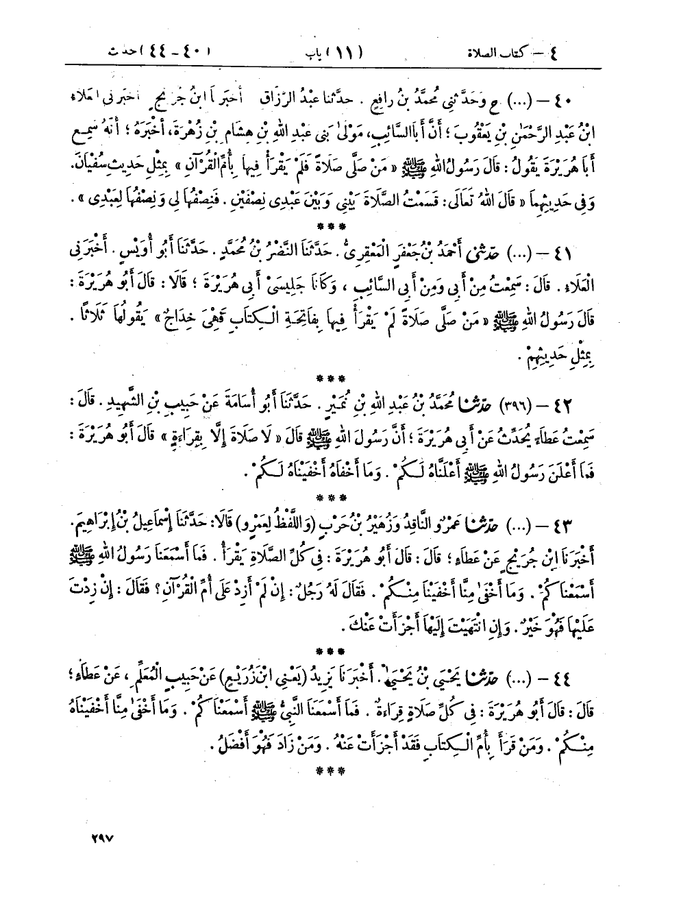 ٤٠ - (٣٩٥) وَحَدَّثَنِي مُحَمَّدُ بْنُ رَافِعٍ، حَدَّثَنَا عَبْدُ الرَّزَّاقِ، أَخْبَرَنَا ابْنُ جُريْجٍ، أَخْبَرَنِي العلَاءُ بْنُ عَبْدِ الرَّحْمنِ بْنِ يَعْقُوبَ، أَنَّ أَبَا السَّائِبِ، مَوْلَى بَنِي عَبْدِ اللهِ بْنِ هِشَامِ بْنِ زُهْرَةَ، أَخْبَرَهُ أَنَّهُ سَمِعَ أَبَا هُرَيْرَةَ، يَقُولُ: قَالَ رَسُولُ اللهِ صَلَّى اللهُ عَلَيْهِ وَسَلَّمَ: «مَنْ صلَّى صَلَاةً فَلَمْ يَقْرَأْ فِيهَا بِأُمِّ الْقُرْآنِ» بِمِثْلِ حَدِيثِ سُفْيَانَ وَفِي حَدِيثِهِمَا قَالَ اللهُ تَعَالَى: «قَسَمْتُ الصَّلَاةَ بَيْنِي وَبَيْنَ عَبْدِي نِصْفَيْنِ فَنِصْفُهَا لِي وَنِصْفُهَا لِعَبْدِي»