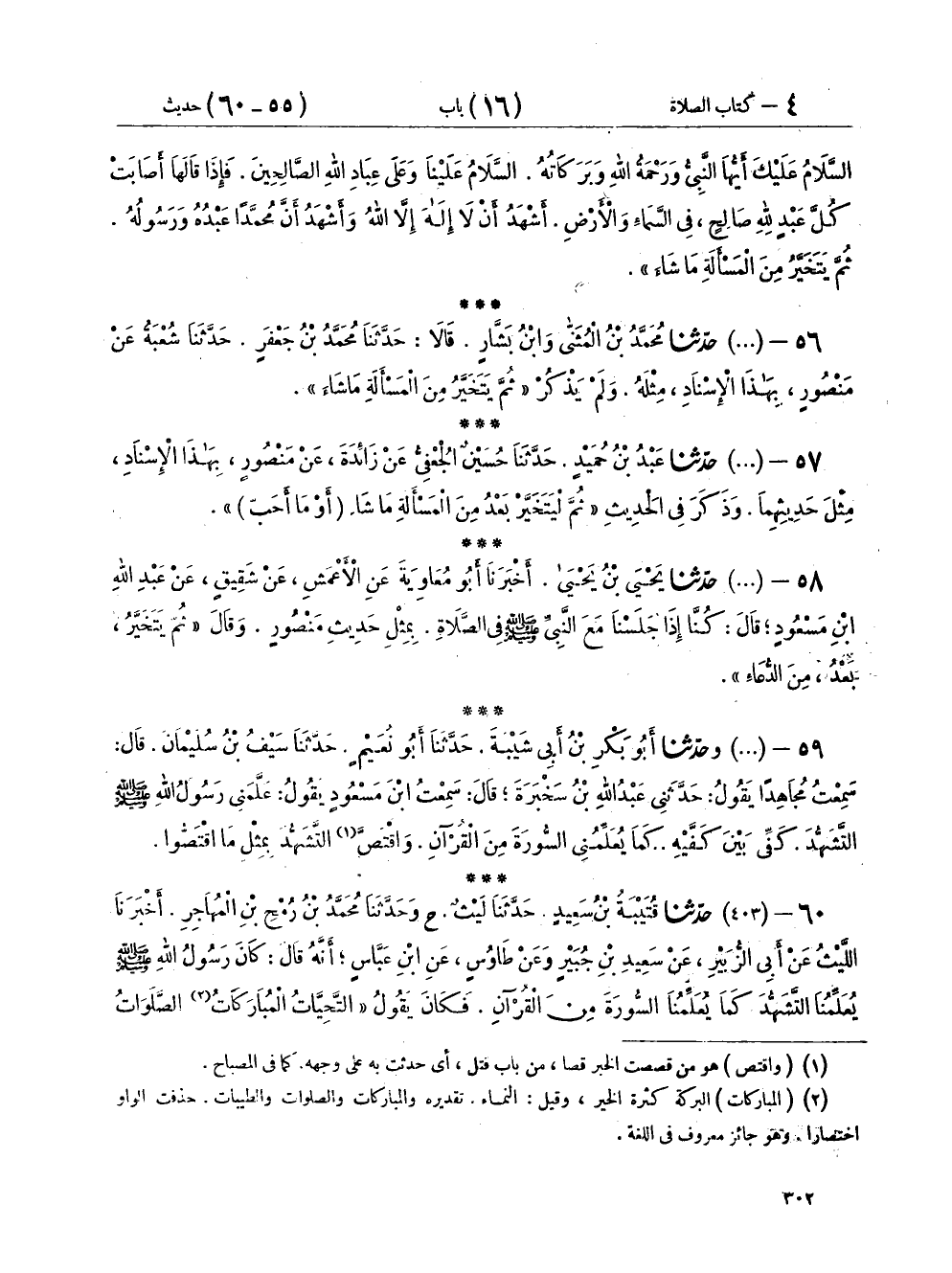٥٨ - (٤٠٢) حَدَّثَنَا يَحْيَى بْنُ يَحْيَى، أَخْبَرَنَا أَبُو مُعَاوِيَةَ، عَنِ الْأَعْمَشِ، عَنْ شَقِيقٍ، عَنْ عَبْدِ اللهِ بْنِ مَسْعُودٍ، قَالَ: كُنَّا إِذَا جَلَسْنَا مَعَ النَّبِيِّ صَلَّى اللهُ عَلَيْهِ وَسَلَّمَ فِي الصَّلَاةِ بِمِثْلِ حَدِيثِ مَنْصُورٍ وَقَالَ: «ثُمَّ يَتَخَيَّرُ بَعْدُ مِنَ الدُّعَاءِ»