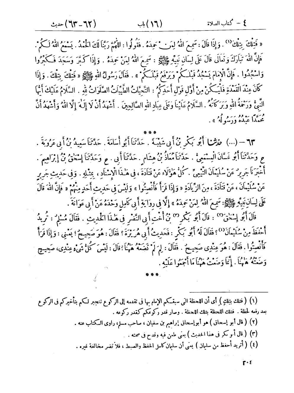 ٦٣ - (٤٠٤) حَدَّثَنَا أَبُو بَكْرِ بْنُ أَبِي شَيْبَةَ، حَدَّثَنَا أَبُو أُسَامَةَ، حَدَّثَنَا سَعِيدُ بْنُ أَبِي عَرُوبَةَ، ح وَحَدَّثَنَا أَبُو غَسَّانَ الْمِسْمَعِيُّ، حَدَّثَنَا مُعَاذُ بْنُ هِشَامٍ، حَدَّثَنَا أَبِي، ح وَحَدَّثَنَا إِسْحَاقُ بْنُ إِبْرَاهِيمَ أَخْبَرَنَا جَرِيرٌ، عَنْ سُلَيْمَانَ التَّيْمِيِّ، كُلُّ هَؤُلَاءِ عَنْ قَتَادَةَ، فِي هَذَا الْإِسْنَادِ بِمِثْلِهِ وَفِي حَدِيثِ جَرِيرٍ، عَنْ سُلَيْمَانَ، عَنْ قَتَادَةَ مِنَ الزِّيَادَةِ» وَإِذَا قَرَأَ فَأَنْصِتُوا " وَلَيْسَ فِي حَدِيثِ أَحَدٍ مِنْهُمْ فَإِنَّ اللهَ قَالَ عَلَى لِسَانِ نَبِيِّهِ صَلَّى اللهُ عَلَيْهِ وَسَلَّمَ: «سَمِعَ اللهُ لِمَنْ حَمِدَهُ» إِلَّا فِي رِوَايَةِ أَبِي كَامِلٍ، وَحْدَهُ عَنْ أَبِي عَوَانَةَ قَالَ أَبُو إِسْحَاقَ: قَالَ أَبُو بَكْرِ: ابْنُ أُخْتِ أَبِي النَّضْرِ فِي هَذَا الْحَدِيثِ. فَقَالَ مُسْلِمٌ: تُرِيدُ أَحْفَظَ مِنْ سُلَيْمَانَ؟ فَقَالَ لَهُ أَبُو بَكْرٍ: فَحَدِيثُ أَبِي هُرَيْرَةَ؟ فَقَالَ: هُوَ صَحِيحٌ يَعْنِي وَإِذَا قَرَأَ فَأَنْصِتُوا فَقَالَ: هُوَ عِنْدِي صَحِيحٌ فَقَالَ: لِمَ لِمَ تَضَعْهُ هَا هُنَا؟ قَالَ: لَيْسَ كُلُّ شَيْءٍ عِنْدِي صَحِيحٍ وَضَعْتُهُ هَا هُنَا إِنَّمَا وَضَعْتُ هَا هُنَا مَا أَجْمَعُوا عَلَيْهِ
