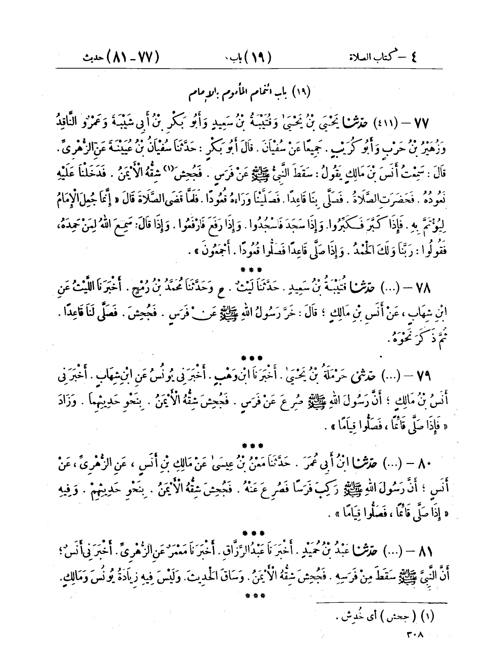 ٧٧ - (٤١١) حَدَّثَنَا يَحْيَى بْنُ يَحْيَى، وَقُتَيْبَةُ بْنُ سَعِيدٍ، وَأَبُو بَكْرِ بْنُ أَبِي شَيْبَةَ، وَعَمْرٌو النَّاقِدُ، وَزُهَيْرُ بْنُ حَرْبٍ، وَأَبُو كُرَيْبٍ، جَمِيعًا عَنْ سُفْيَانَ - قَالَ أَبُو بَكْرٍ: حَدَّثَنَا سُفْيَانُ بْنُ عُيَيْنَةَ - عَنِ الزُّهْرِيِّ، قَالَ: سَمِعْتُ أَنَسَ بْنَ مَالِكٍ، يَقُولُ: سَقَطَ النَّبِيُّ صَلَّى اللهُ عَلَيْهِ وَسَلَّمَ عَنْ فَرَسٍ فَجُحِشَ شِقُّهُ الْأَيْمَنُ، فَدَخَلْنَا عَلَيْهِ نَعُودُهُ، فَحَضَرَتِ الصَّلَاةُ، فَصَلَّى بِنَا قَاعِدًا، فَصَلَّيْنَا وَرَاءَهُ قُعُودًا، فَلَمَّا قَضَى الصَّلَاةَ قَالَ: " إِنَّمَا جُعِلَ الْإِمَامُ لِيُؤْتَمَّ بِهِ، فَإِذَا كَبَّرَ فَكَبِّرُوا، وَإِذَا سَجَدَ فَاسْجُدُوا، وَإِذَا رَفَعَ فَارْفَعُوا وَإِذَا قَالَ: سَمِعَ اللهُ لِمَنْ حَمِدَهُ. فَقُولُوا: رَبَّنَا وَلَكَ الْحَمْدُ، وَإِذَا صَلَّى قَاعِدًا، فَصَلُّوا قُعُودًا أَجْمَعُونَ «